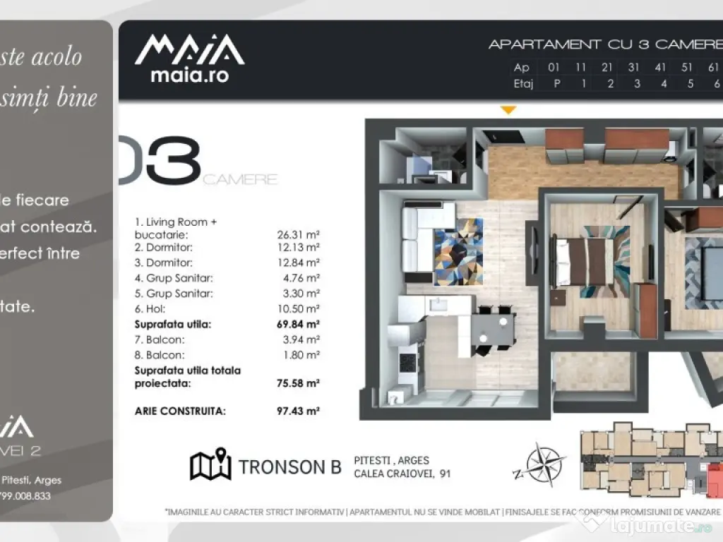 Preturile afisate sunt promotionale, valabile pentru un avans de 50% si diferenta in transe lunare pana la predarea apartamentului. Acestea sunt fara TVA si cu predare la stadiul semifinisat | Costul finisajelor este de 150 EUR fara TVA pe mp construit. Apartamente Noi în Ansamblul Maia Craiovei – Corp B Pitești, Calea Craiovei 91 – Locație ultracentrală, aproape de tot ce contează Descoperă un stil de viață urban modern, într-un ansamblu rezidențial de calitate superioară, aflat în inima Piteștiului, cu acces facil către Autostrada A1 și punctele cheie ale orașului. Calitate în fiecare detaliu Finisaje premium & dotări moderne: - Centrală termică în condensație – Buderus (sau similar) - Încălzire în pardoseală – REHAU (sau similar) - Cadru WC încastrat – Grohe/TECE (sau similar) - Uși metalice de intrare – PINUM / MEGADOOR (sau similar) - Tâmplărie PVC tripan – Gealan (sau similar) gri exterior, alb interior - Glet, șape, rețele TV/telefonie/internet incluse - Spații comune finisate modern, cu 2 lifturi Schindler per corp Finisaje la alegere: - Parchet laminat EGGER/YILDIZ (sau similar) 8–10 mm ~10 modele - Gresie & faianță import Spania/Italia – 3 colecții - Obiecte sanitare Cersanit/Roca (sau similar) - Uși de interior VELTA DOORS (sau similar) - Prize și întrerupătoare incluse Construcție solidă & izolare excelentă - Zidărie între apartamente: min. 25 cm grosime - Compartimentări finisate cu tencuială + vopsea lavabilă - Tâmplărie tripan low-emission - Fațadă cu polistiren 10 cm, tencuială decorativă (alb & gri închis) - Acoperiș tip terasă necirculabilă, izolat termic și hidro Facilități ale ansamblului - 2 lifturi/segment (acces de la orice nivel) - Spații verzi amenajate - Interfon - Casă scării finisată modern Localizare Premium Situat pe Calea Craiovei 91, Corpul B al ansamblului MAIA te aduce aproape de tot ce ai nevoie: - Transport în comun: stațiile C.A. Rosetti și Negoiu - Bănci: Unicredit, Transilvania, Raiffeisen - Shopping: Piața Craiovei, Lidl, Kaufland, Trivale Shopping Center Educație și Grădinițe în apropiere - Grădinița PP Nr. 19, Kinder World Dream, Kinder Strumff - Școli gimnaziale și colegii de prestigiu (IL Caragiale, Zinca Golescu, Brătianu, Teiuleanu, Armand Călinescu) - Universitatea din Pitești Recreere & Lifestyle - Parcul Trivale, Grădina Zoologică, Expo Parc - Cinema Trivale, Teatrul Davila, Muzeul Județean - Piscina Trivale, Xtreme Fitness Gym Toate la mai puțin de 10 minute de mers! Sănătate & Îngrijire - Spitalul de Pediatrie Pitești - Muntenia Medical Hospital - Tedy Care, Centrul Sanovital Informații importante: - Prețurile NU conțin TVA – acesta se adaugă conform normelor în vigoare - Ansamblul este în construcție – Certificatul energetic nu este încă disponibil Contact vânzări: 0799 008 833 Programează o vizionare sau cere mai multe detalii! Confort: 1 Tip imobil: Bloc de apartamente Număr Băi: 2 Comision cumpărător: 0%