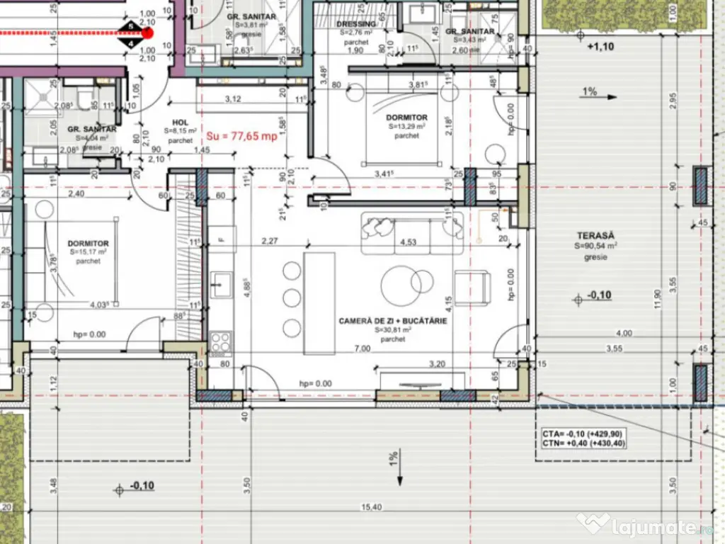 Blitz va prezinta un apartament cu 3 camere în Terra Gardens, Cluj-Napoca – de la 1850 €/mp plus TVA Locuințe moderne într-un ansamblu exclusivist cu acces privat, compus din case și blocuri cu regim redus de înălțime – o alegere ideală pentru familii sau investiție sigură. Parcări subterane disponibile (10.000 € TVA INCLUS) Plata se face conform LEGII NORDIS: - 5% la faza incipienta - 25% la finalizarea structurii - 20% la finalizarea instalatiilor - 50% la contractul final prin surse proprii sau credit ipotecar. Termen de finalizare: decembrie 2026 Exemplu disponibil – Parter • Suprafață utilă: 77,65 • Terasa- 90 mp • 2 dormitoare, 2 băi • Living generos cu bucătărie open-space • Un balcon • Predare la stadiul de semifinisat – 2 mâini de glet, șapă, instalații trase pe poziții • Încălzire în pardoseală • Centrală termică smart pe bloc Cod ofertă / ID BLITZ: P149943 Id intern: P149943 Confort: 1 Tip imobil: Bloc de apartamente Număr Băi: 2