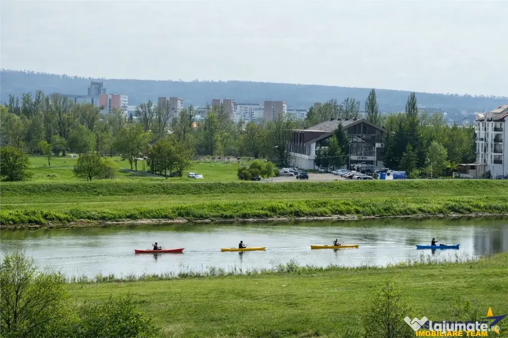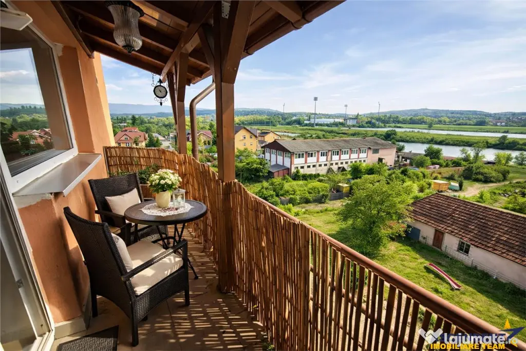 Panorama este cu adevarat speciala si creeaza zilnic un sentiment de armonie. De pe balconul generos de 8 mp, amenajat in stil rustic, poti urmari antrenamentele echipajelor de caiac canoe pe raul Mures, un spectacol viu care aduce calm si claritate mentala. In zilele senine, din bucatarie se contureaza la orizont crestele Muntilor Calimani, oferind un cadru rar si memorabil.