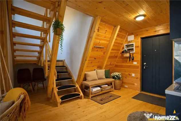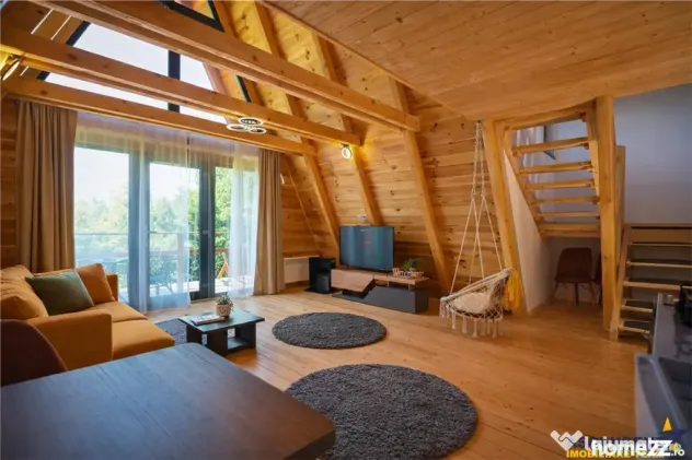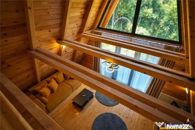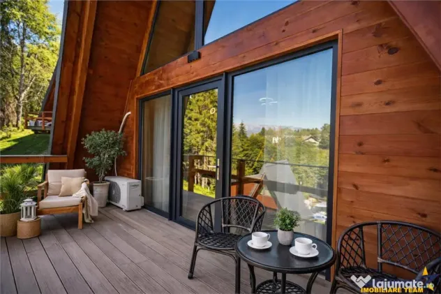 Arhitectura tip A Frame aduce un aer cosmopolit si elegant, imbinand armonios liniile simple si moderne cu farmecul materialelor naturale, creand astfel un ambient cald si primitor, perfect pentru relaxare si confort.