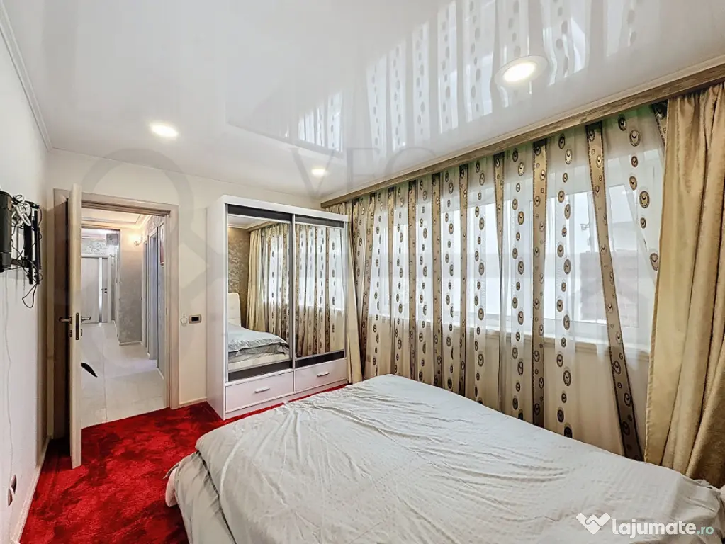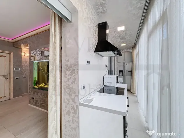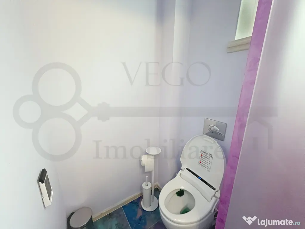 Locuința se desfășoară pe o suprafață utilă foarte generoasă, de 100 mp, beneficiază de o terasă de aproximativ 50 mp, se închiriază complet finisată, mobilată și utilată, cu materiale și electrocasnice de înaltă calitate, inclusiv cu mașină de spălat vase, mașină de spălat rufe cu uscător, 2 TV LCD Sony 175 inch, cabină duș cu hidromasaj și saună, draperii cu sistem de acționare electrică și multe alte facilități, iar confortul termic este asigurat pe tot parcursul anului de centrala termică individuală cu sistem de încălzire prin pardoseală și aparatul de aer condiționat.