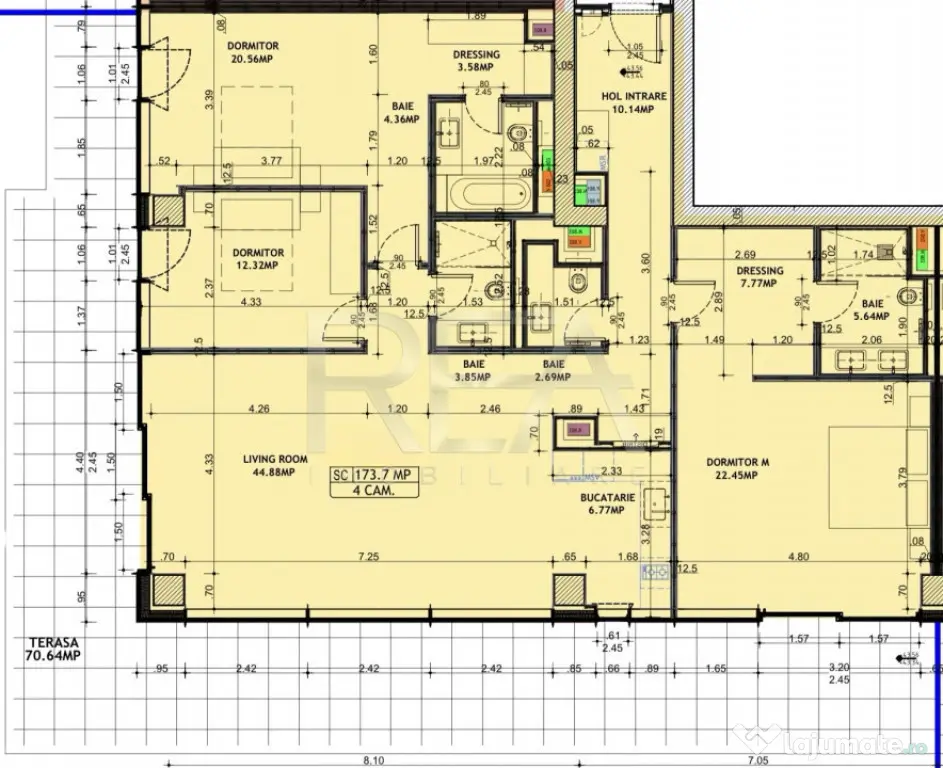 - Configurație: living cu bucătărie open space, 3 dormitoare, 2 dressing-uri, hol intrare, 3 băi, spălătorie și terasă.
