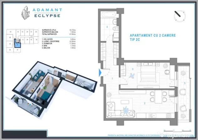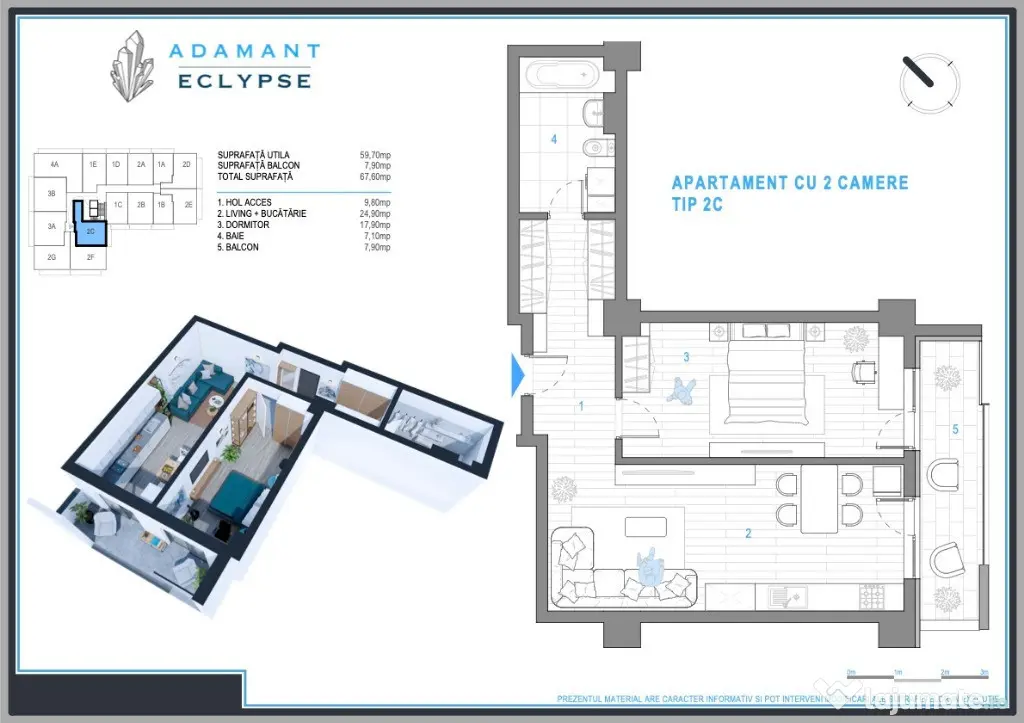 Apartament 2 camere, tip 2C, openspace, suprafață totală 67,6mp, suprafață utilă 59,7mp, suprafata balcon 7,9mp, compartimentat astfel: hol = 9,8mp, living + bucatarie = 24,9mp, dormitor = 17,9mp, baie = 7,1mp.