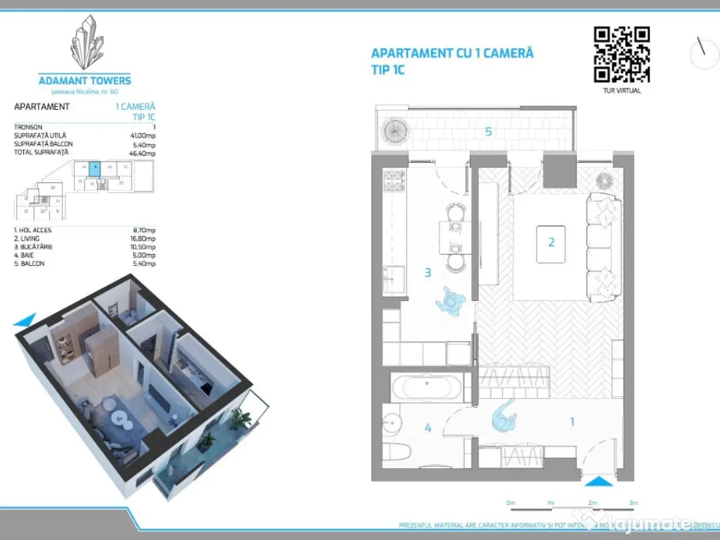 Apartament finalizat de 1 cameră 46.4mp, decomandat, situat la etajul 8 din 10 din blocul 1 cu o suprafaţă utilă de 41 mp si un balcon tip terasă de 5.4mp. Situat în Șos. Nicolina 54, în zona CUG – Rond Vechi Iași, complexul se află la doar 7-8 minute de Palas Mall, oferă acces ușor la stații de transport public (vizavi de complex), piață alimentară, grădinițe, supermarket-uri. Acesta este echipat cu: încălzire prin pardoseală, tavane Barrisol, tâmplărie PVC de înaltă calitate, aer condiționat, baie și bucătărie cu gresie din import, obiecte sanitare premium. Facilități complex: spații comerciale, sală de fitness, spații verzi, parcare subterană, acces securizat, iluminare ambientală la exterior. Preț 83.030 euro + TVA - plata avans 100% Confort: 1 Tip imobil: Bloc de apartamente Număr Băi: 1 Comision cumpărător: 0% Posibilitate parcare: Da