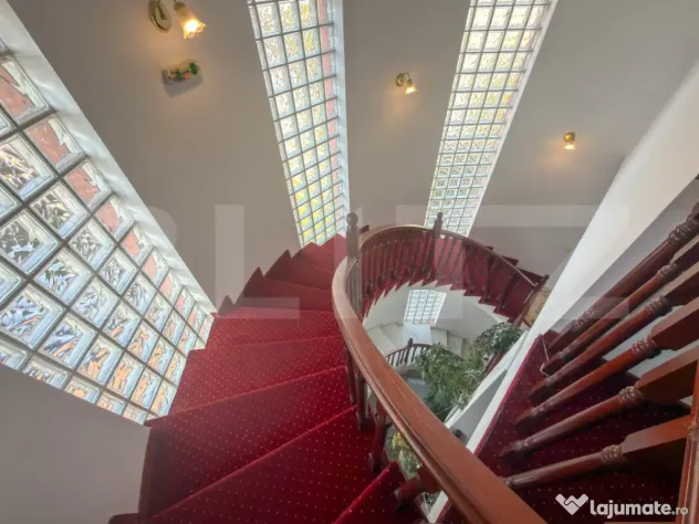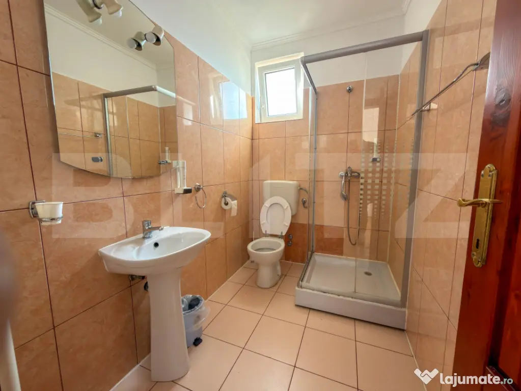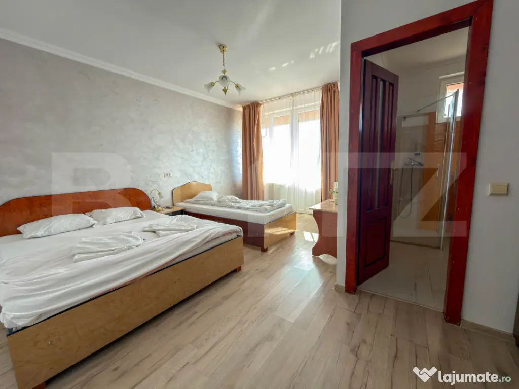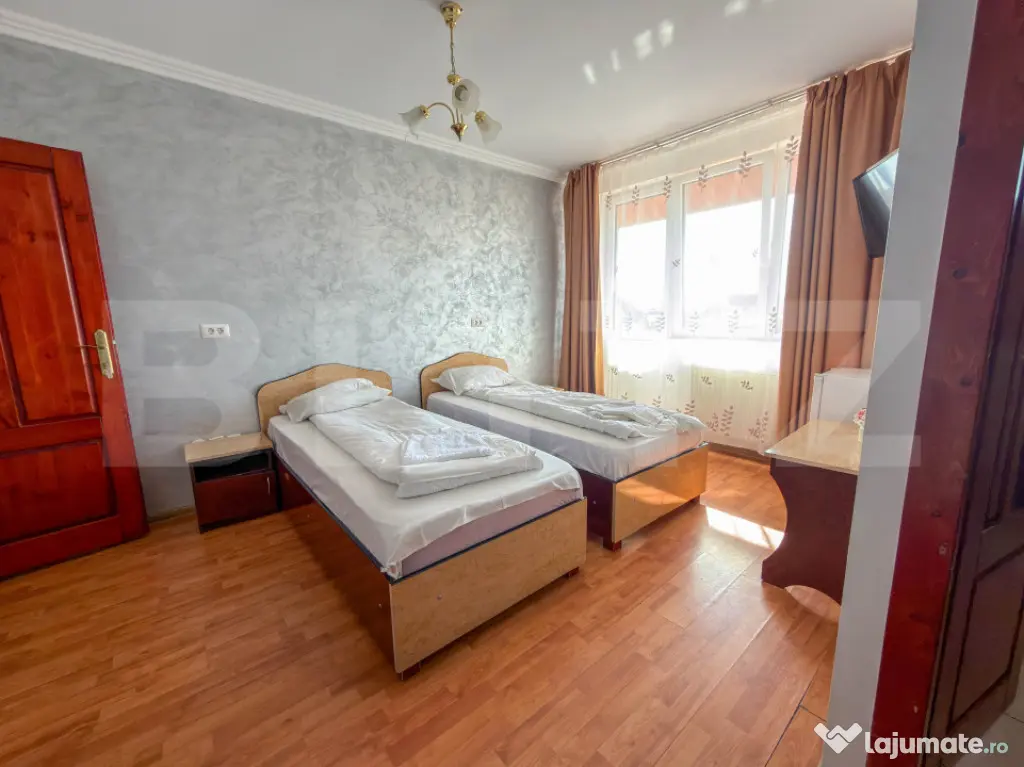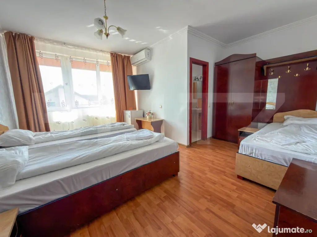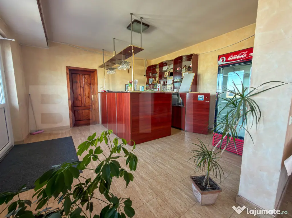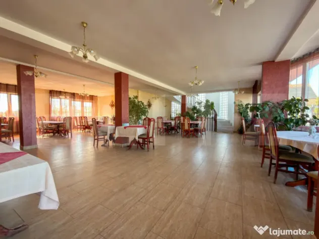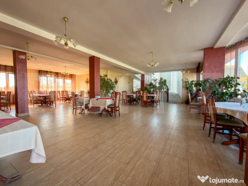Parterul gazduieste un restaurant generos de 270 mp, autorizat pentru 120 de locuri, deservit de o bucatarie complet dotata si pregatita de lucru. Este spatiul perfect pentru asigurarea meselor zilnice ale rezidentilor sau turistilor. De asemenea, confortul auto este asigurat de o parcare proprie extrem de generoasa, capabila sa deserveasca fara probleme atat personalul, cat si un numar mare de oaspeti sau vizitatori.