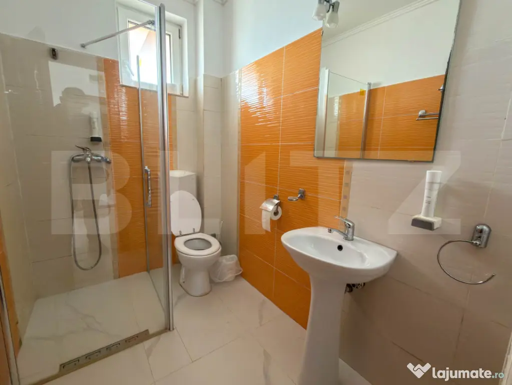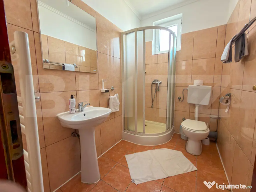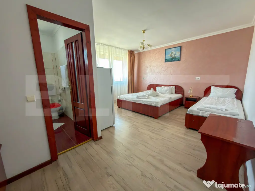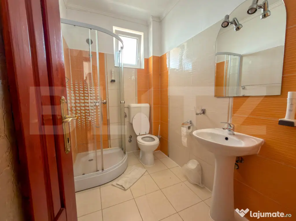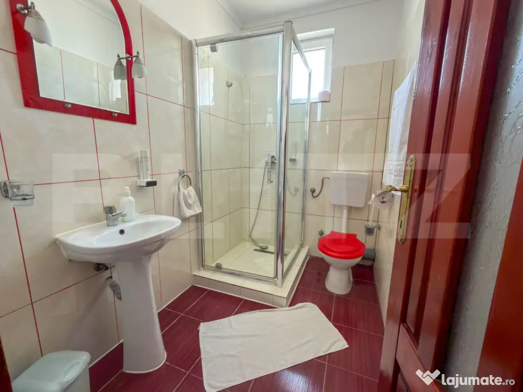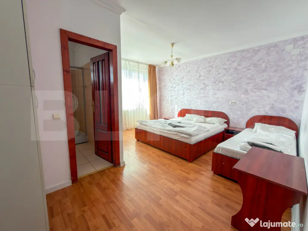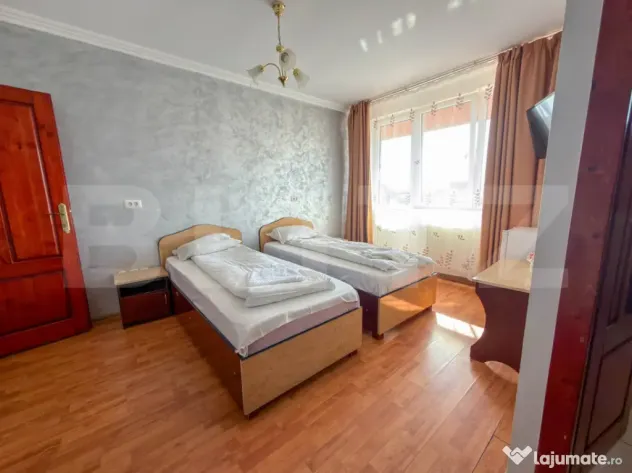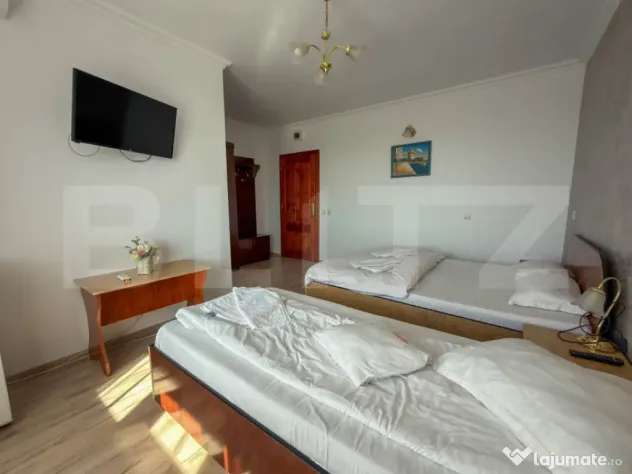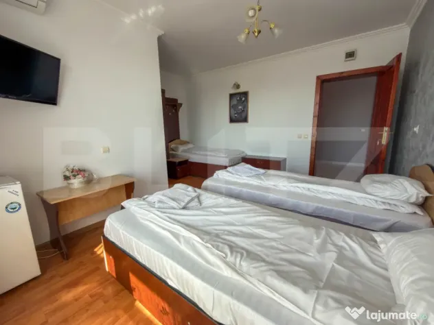 Amplasata pe un teren de 800 mp, constructia are regimul de inaltime D + P + 2 Etaje. Suprafata construita este de 1300 mp, din care 1030 mp utili. Spatiul ofera o capacitate de 60 de persoane, fiind impartit in 15 camere si 3 apartamente. Confortul este prioritar: fiecare unitate beneficiaza de aer conditionat, intreg etajul 1 are acces la balcoane, iar absolut toate baile au geam pentru aerisire naturala.