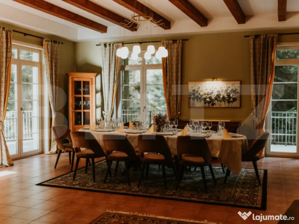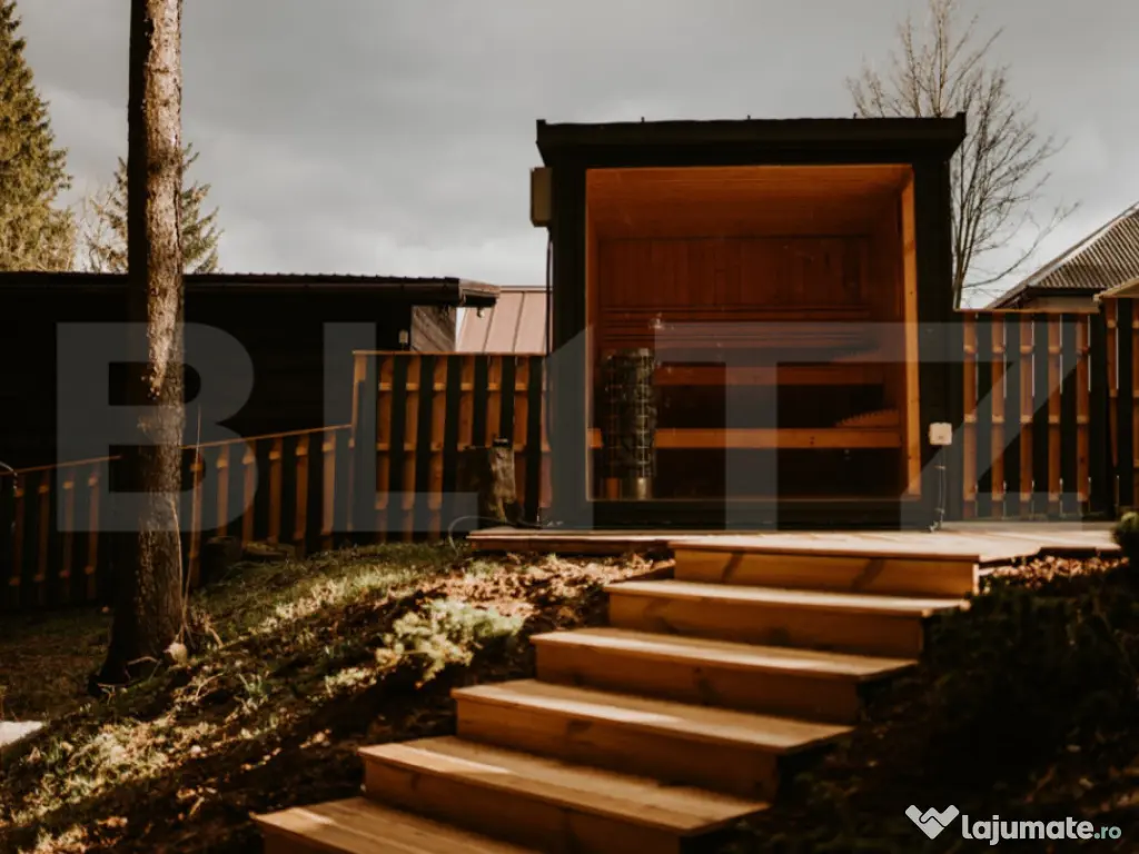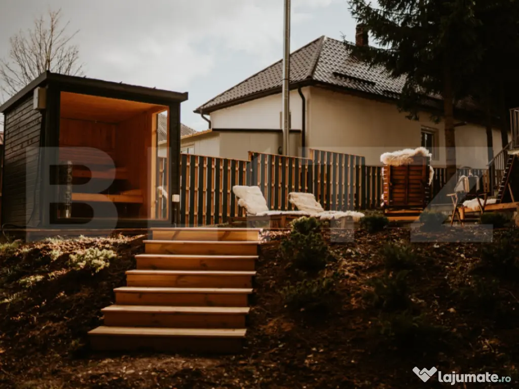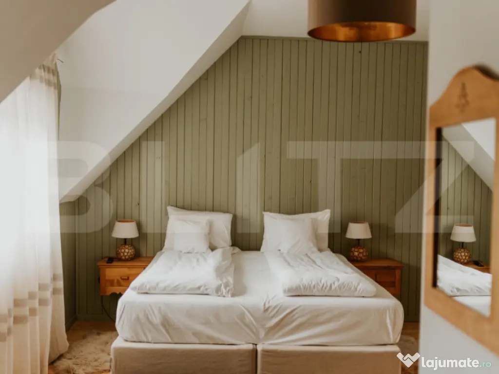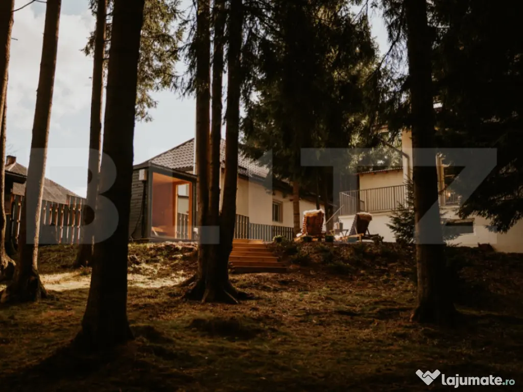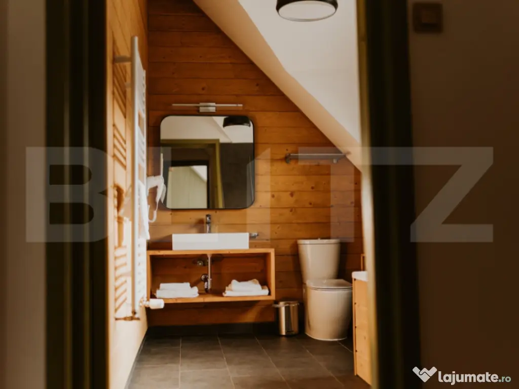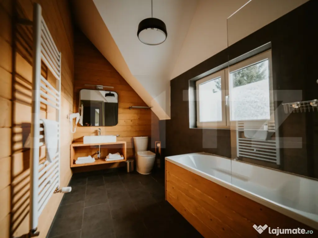 Blitz va prezinta o vilă premium în Beliș – afacere la cheie, complet funcțională în circuit turistic Descoperă o proprietate unică, situată în inima naturii, în comuna Beliș, județul Cluj, o zonă renumită pentru peisajele spectaculoase și aerul curat de munte. Această vilă premium de aproximativ 300 mp, complet renovată și modernizată în perioada 2020–2021, reprezintă alegerea ideală pentru cei care doresc o afacere turistică la cheie sau o casă de vacanță exclusivistă. Caracteristici generale Suprafață construită: aprox. 300 mp Teren: 1.600 mp (curte concesionată pe 70 de ani de la Primărie) Construcție solidă din cărămidă și beton, acoperiș din țiglă (1994) Complet renovată cu finisaje de calitate Încălzire centrală pe lemne și peleți Ferestre termopan cu 3 straturi pentru izolație superioară Compartimentare și dotări interioare 5 dormitoare spațioase, fiecare cu baie proprie – Paturi duble 180x200 cm, saltele IKEA premium, băi echipate cu baterii Hansgrohe și cabine de duș din sticlă 6 băi în total (inclusiv un grup sanitar pentru living) Living generos de ~70 mp, cu tavan înalt, șemineu, zonă de dining și lounge Bucătărie complet echipată cu electrocasnice moderne Subsol spațios (50–70 mp) pentru depozitare sau amenajări suplimentare Terasă exterioară de 70 mp – perfectă pentru relaxare sau mese în aer liber Facilități exterioare Jacuzzi exterior pentru 6–8 persoane Saună cu cuptor electric Terasă cu șezlonguri și vedere spre pădure Curte superb amenajată cu brazi înalți și spațiu verde generos Utilități și avantaje Racordată la apă, canalizare și curent trifazic Certificat de clasificare emis de Ministerul Turismului – poate fi exploatată imediat ca unitate turistică Business la cheie – se vinde complet mobilată, utilată și funcțională Recenzii excelente și potențial ridicat de închiriere în regim turistic Această proprietate reprezintă o oportunitate excelentă de investiție în una dintre cele mai căutate destinații montane din Cluj. Ideală atât pentru exploatare imediată în regim hotelier, cât și ca refugiu de vacanță pentru familie. Cod ofertă / ID BLITZ: P157042 Id intern: P157042 Stadiu construcţie: Finalizat Număr încăperi: 5