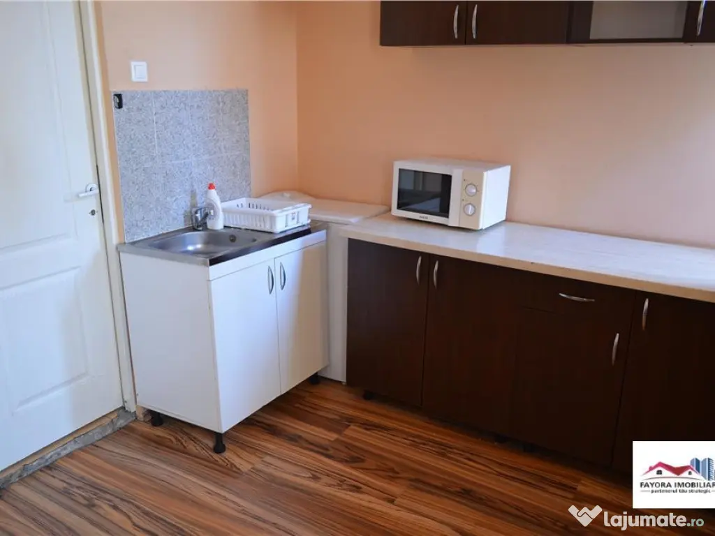Ap. 1 Camera cu Parcare Inclusa de Inchiriat Zona Ultracentrala Fayora Imobiliare va ofera spre inchiriere un apartament cu o camera, mobilat si utilat, situat in zona ultracentrala, avand suprafata aproximativa de 35 mp. Imobilul este compus din: o camera, o bucatarie si o baie. Apartamentul este dotat cu geamuri termopan, parchet, gresie, faianta si este utilat cu frigider, aragaz, cuptor cu microunde, masina de spalat rufe, televizor. In apropiere se afla magazine, statie de autobuz, scoli, institutii publice, restaurante, farmacii, parc etc. Pretul lunar este de 400 euro si include: chiria, utilitatile si un loc de parcare privat. Contactandu-ne pe noi, daca sunteti clienti cumparatori beneficiati de servicii de consultanta gratuita si nu vi se va percepe comision. Suntem pregatiti si hotarati sa va oferim cele mai bune solutii in domeniul imobiliar, fie ca este vorba de cele mai competitive preturi, oferte personalizate conform cerintelor dvs. sau de asistenta pe intreaga durata a efectuarii tranzactiei. Cu responsabilitate, echipa Fayora Imobiliare face ca lucrurile sa se concretizeze, face ca oamenii sa isi indeplineasca visurile. Confort: 1 sporit Tip imobil: Bloc de apartamente Număr Băi: 1