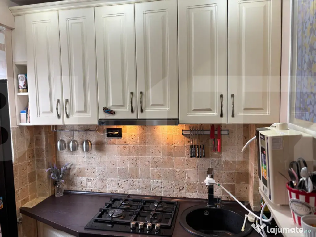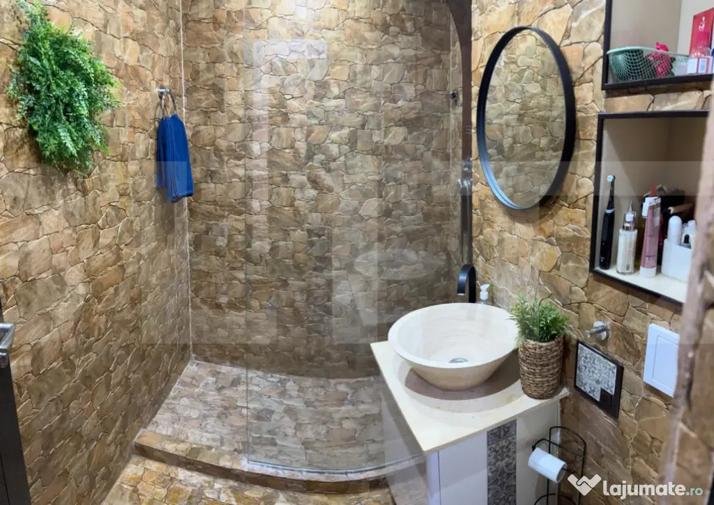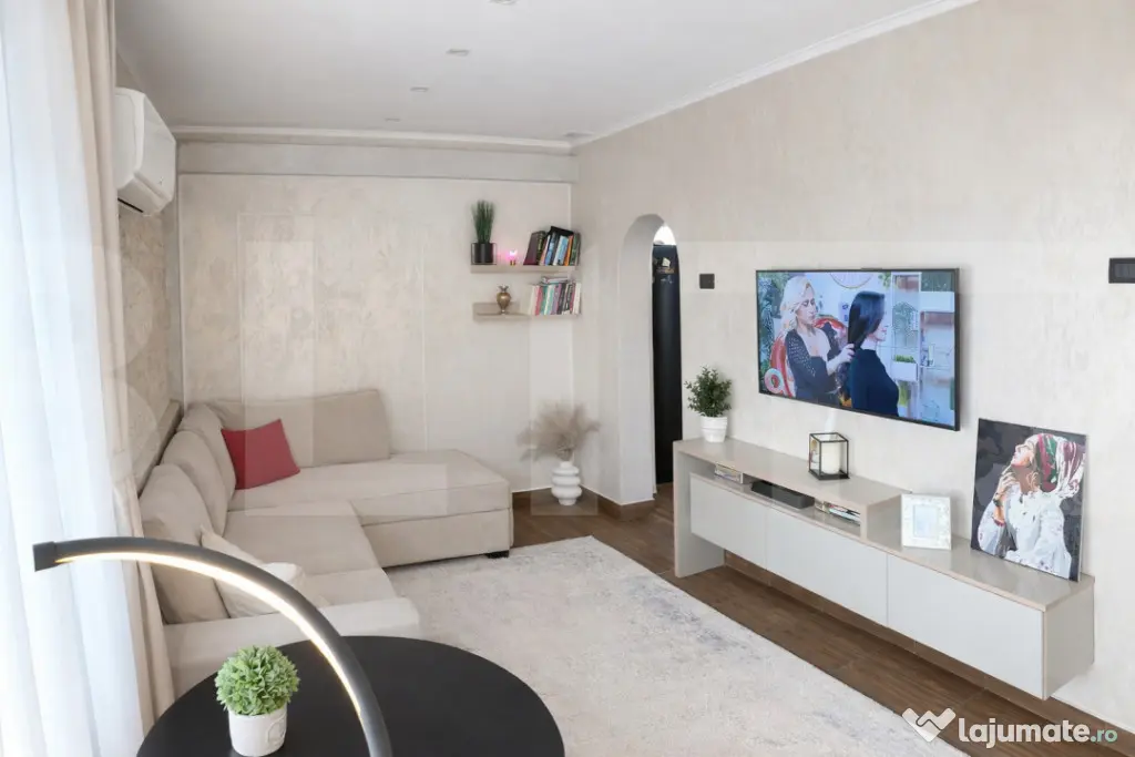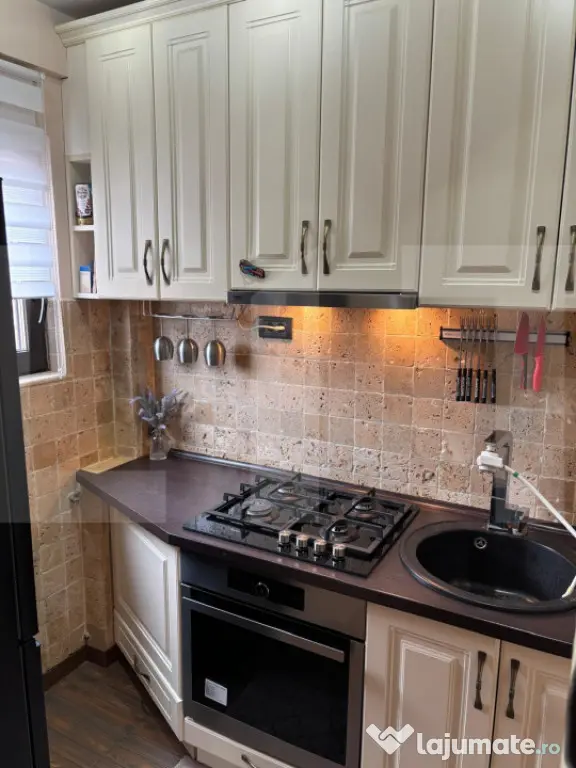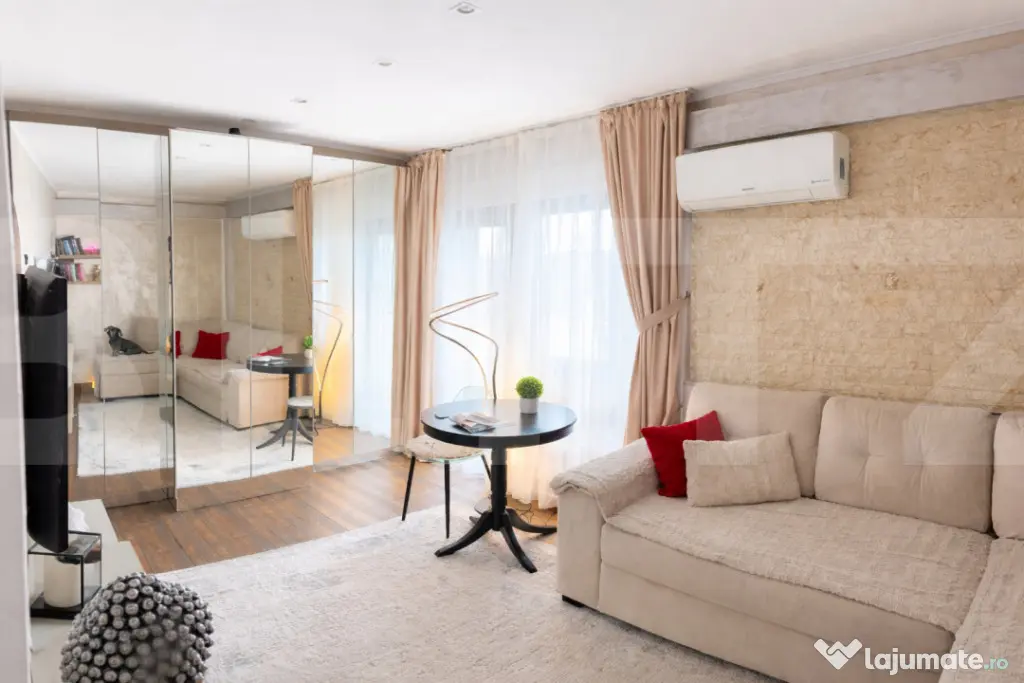 Imobilul este renovat integral, cu finisaje premium, realizate calitativ și funcțional, evidențiindu-se prin finisaje cu piatră naturală și travertin, iar mobilierul este realizat la comandă, adaptat perfect dimensiunilor spațiului, cu multiple soluții de depozitare și inserții de oglinzi care creează senzația unui spațiu generos și luminos.