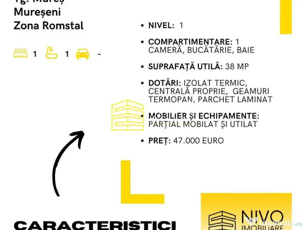 BV/313 Nivo Imobiliare vă propune spre vânzare acest apartament situat în Tg. Mureș, cartierul Mureșeni, Zona Romstal. Apartamentul se află la etajul 1 și este compus din 1 cameră, bucătărie și baie având suprafața totală 38 de mp. Este izolat termic, dotat cu centrală proprie, geamuri termopan și parchet laminat. Se vinde parțial mobilat și utilat la prețul de 47.000 Euro 0% comision pentru orice imobil cumpărat. Confort: 1 Tip imobil: Bloc de apartamente Număr Băi: 1 Posibilitate parcare: Nu