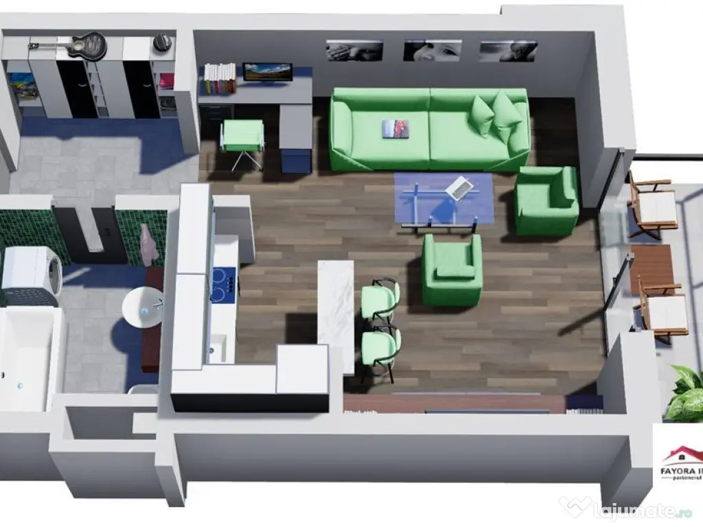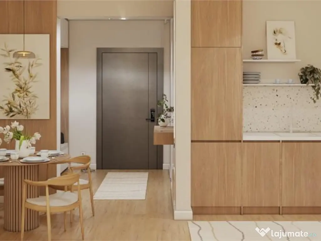 Apartament cu 1 Camera Tip A1 de Vanzare in Ansamblul Green Residence Apartament SMART ndash; confortul viitorului, disponibil acum in Ansamblul Green Residence! Apartamentul este ideal pentru cei care vor o experienta de locuire inteligenta proiectata pentru stilul de viata al prezentului. Fayora Imobiliare impreuna cu Partenerii bancari te ajuta sa obtii un credit imobiliar si daca lucrezi in strainatate, pentru ca se pot lua in calcul si veniturile obtinute in afara tarii. Comisionul este 0 pentru achizitionarea oricarui apartament in Ansamblul Green Residence. Apartamentele Tip A1 au spatii largi avand suprafata utila cu terasa inclusa de 44,4 mp, fiind compuse din: o camera, bucatarie, baie, hol si terasa. Fiind concepute cu camere mari si terase generoase, apartamentele confera spatii luminoase si natural iluminate. Finisaje generale: U#537;a de intrare icirc;n apartament: U#537;#259; HPL vopsit de grosime 5.2 cm cu icirc;nchidere multipunct SMART (deschidere prin amprent#259;, recunoa#537;tere facial#259;, cod sau cheie), include un sistem SMART de video sonerie, izolat#259; fonic, maner Gun Grey, toc #537;i pervaz MDF vopsit pacirc;n#259; icirc;n tavan. U#537;i interioare: U#537;i moderne, lisse (pline), din MDF vopsit, grosime de 40mm, cu toc reglabil, pervaze pe ambele p#259;r#539;i, 3 balamale reglabile, garnitur#259;, broasc#259; #537;i maner negru de calitate superioara. Utilit#259;#539;i: Apartamentele sunt contorizate individual #537;i sunt racordate la re#539;eaua electric#259; #537;i de gaze naturale. Conexiune la re#539;eaua de fibr#259; optic#259; (FTTH - fiber-to-the-home) prin re#539;eaua DIGI. Instala#539;ii termice: Fiecare apartament dispune de o central#259; termic#259; proprie icirc;n condensare Ariston 25KW, cu icirc;nc#259;lzire icirc;n pardoseal#259;. Centralele icirc;n condensare ofer#259; un consum redus de energie, cu pacirc;n#259; la 30% mai pu#539;in fa#539;#259; de o central#259; standard, datorit#259; randamentului mai ridicat. Finisaje interioare Apartamentele se predau in stadiu finisat, la cheie dupa cum urmeaza: Holuri: Peretii #537;i tavanele sunt zugr#259;vite icirc;n alb cu vopsea lavabil#259;, iar pardoseala este placat#259; cu parchet laminat de icirc;nalt#259; calitate. Fiecare apartament este dotat cu distribuitor-colector pentru icirc;nc#259;lzire icirc;n pardoseal#259;, tablou electric, comutator si 2 termostate. Buc#259;t#259;rii: Peretii sunt zugr#259;vi#539;i icirc;n alb. Pardoseala este placat#259; cu parchet laminat. Buc#259;t#259;riile sunt dotate cu central#259; termic#259;, icirc;nc#259;lzire icirc;n pardoseal#259;, instala#539;ie de gaze, senzori de gaze, prize simple #537;i duble. Livinguri: Peretii #537;i tavanele sunt finisate cu glet #537;i zugr#259;vite icirc;n alb. Pardoseala este din parchet laminat de 10 mm grosime. Livingurile sunt dotate cu, instala#539;ie TV, prize internet #537;i prize TV. Dormitoare: Finisajele sunt similare cu cele din living, cu parchet laminat de 10 mm #537;i icirc;nc#259;lzire icirc;n pardoseal#259;. B#259;i: Peretii sunt placati cu faian#539;#259; premium. Pardoseala este placat#259; cu pl#259;ci ceramice de calitate superioar#259;. Baia include obiecte sanitare de calitate, cum ar fi van#259; stand alone pe col#539;, mobilier vanity de calitate icirc;nalt#259; cu lavoar compozit / Corain #537;i baterii de calitate superioar#259;, WC cu func#539;ii SMART (icirc;nc#259;lzire capac, bideu, sp#259;l#259;tor, func#539;ie de deschidere / icirc;nchidere cu sensor, lumina LED pe timp de noapte) cu rezervor, radiator portprosop, prize #537;i ventilator. Finisaje exterioare si amenajare Confort: lux Tip imobil: Bloc de apartamente Număr Băi: 1