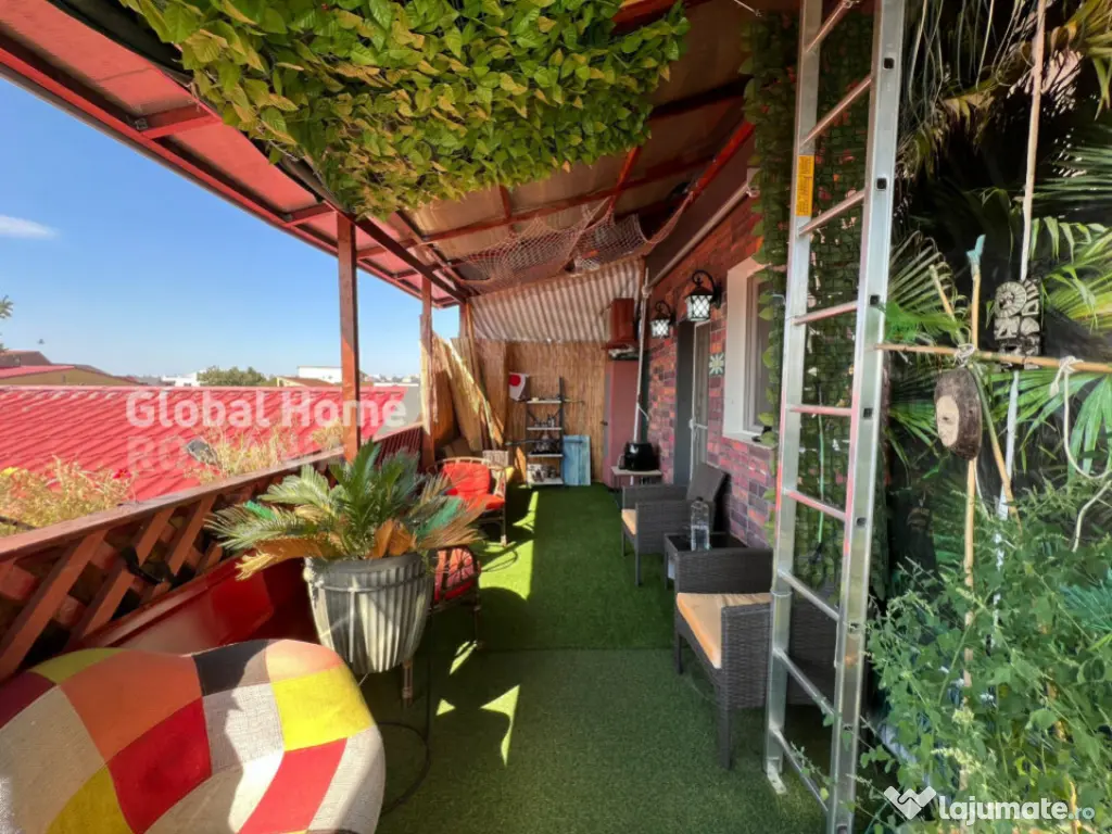 Un apartament luminos, cu o terasă de 17 mp — închisă iarna, deschisă vara — un spațiu liniștit, plin de plante exotice care pot rezista și în sezonul rece. În fața terasei se află doi brazi uriași care creează senzația unei stațiuni montane, dacă ignorăm blocurile de la orizont.