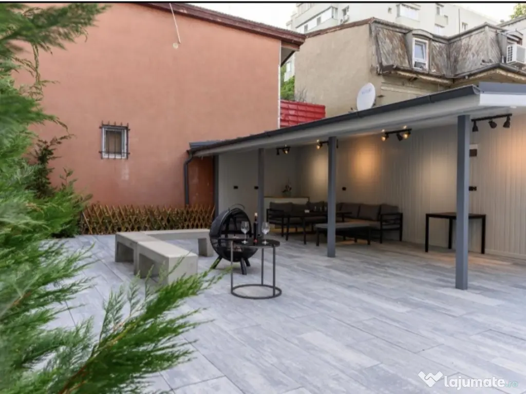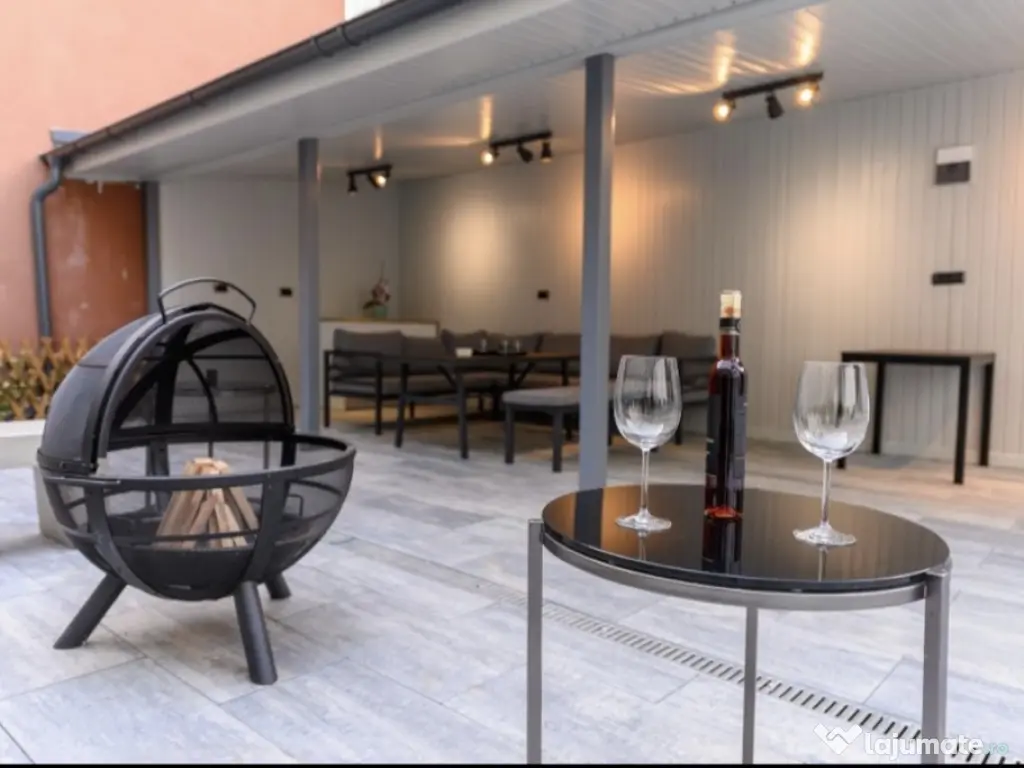 Vila in care se afla apartamentul beneficiaza de o curte interioara spatioasa in care se gaseste o terasa acoperita si mobilata cu mese si canapele, un semineu exterior, banci pentru relaxare si spatiu verde. Curtea interioara si terasa sunt comune pentru toate cele 6 apartamente.