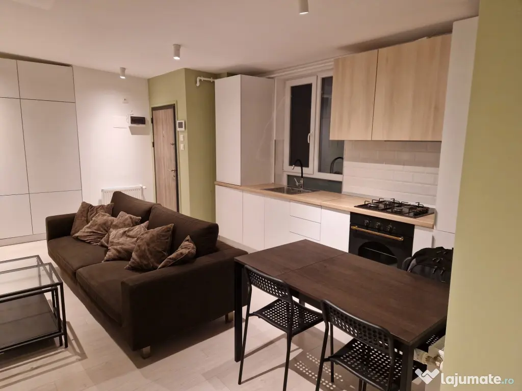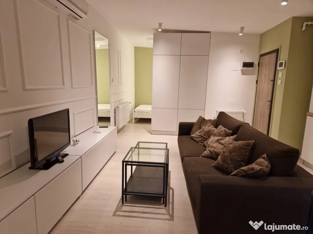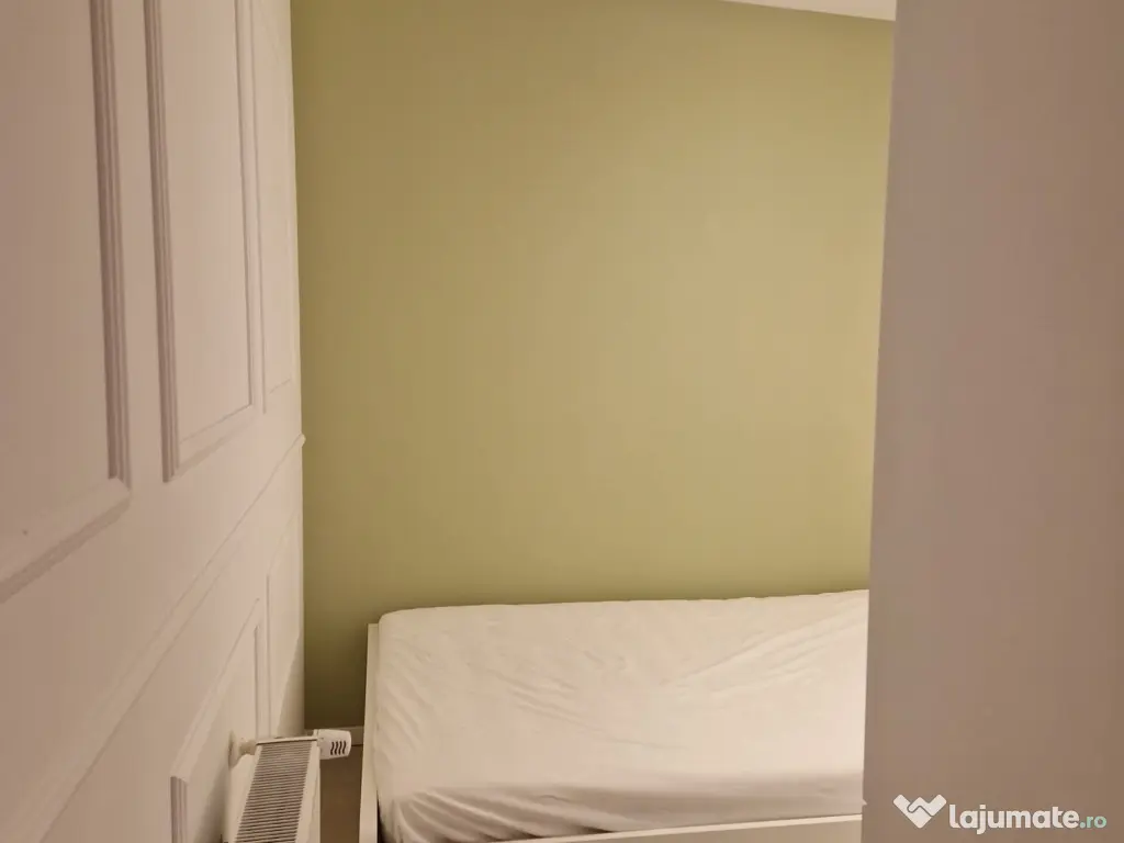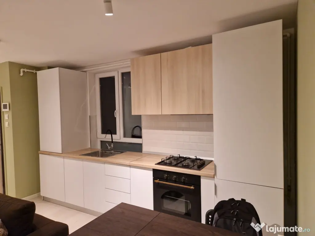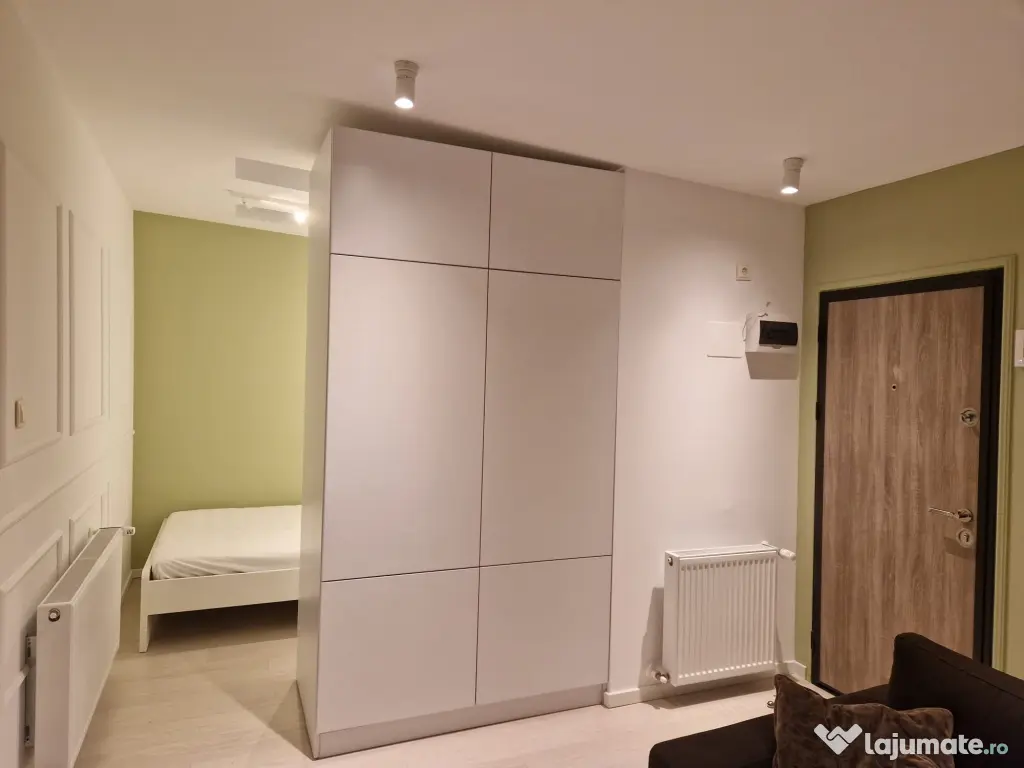 - mobilier modern si functional, pat dormitor 140x200 cm, canapea de 3 locuri dar neexpensibila in living, birou de lucru, multe spatii de depozitare