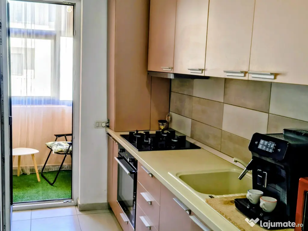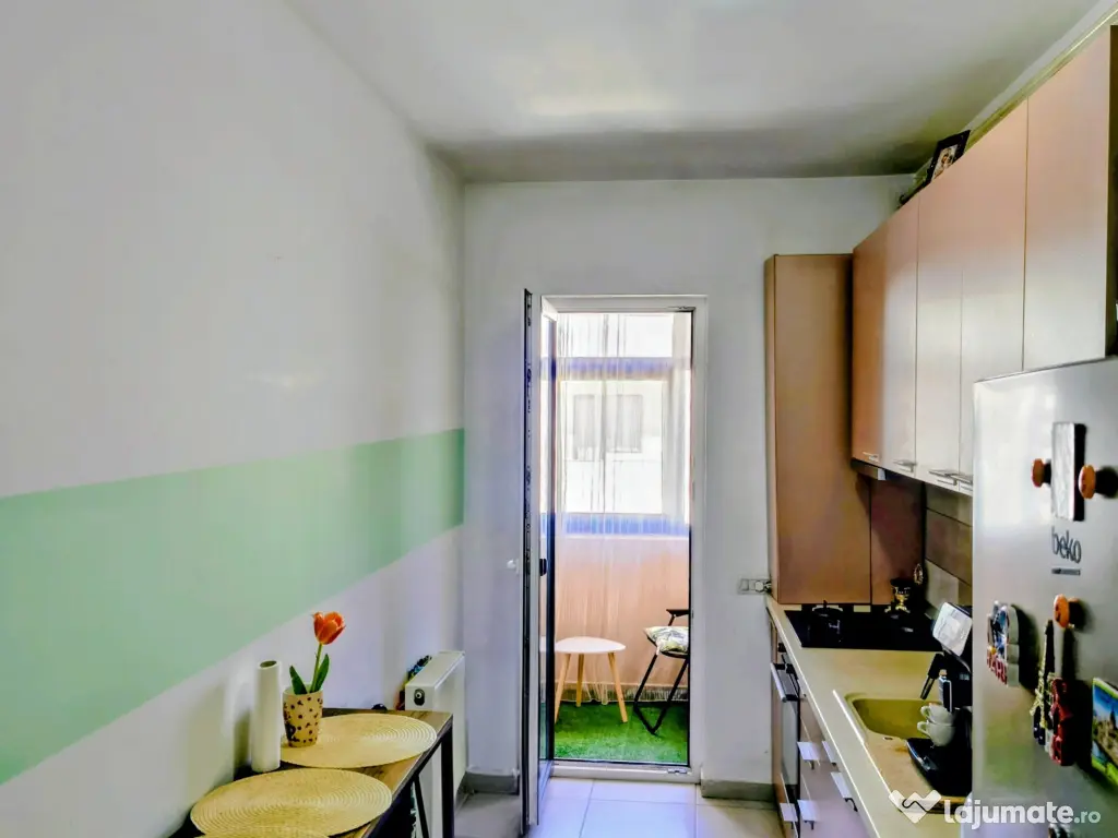 Bucătărie: suprafață 8,68 m.p complet utilată (aragaz, hotă, frigider), mobilier funcțional