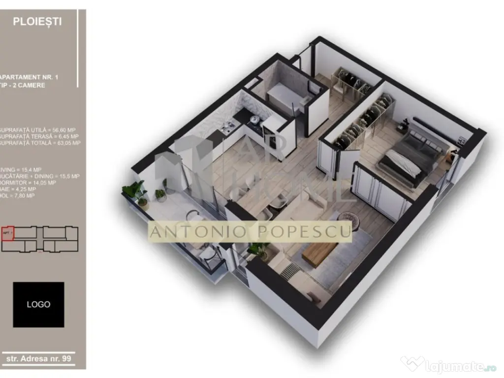 Vanzare apartament 2 camere, in Ploiesti, zona Albert (Kaufland). Imobilul are regimul de inaltime S P 3 4 retras si se afla intr-o zona de case si blocuri nou construite, pe o strada fara trafic auto intens, avand ca vecinatati supermarket Kaufland, MRS Smart, MRS Gradinile, mijloc de transport in comun, parc, piata, scoli, gradinite, restaurante etc. Este construit cu fundatie de beton armat izolata termic cu polistiren extrudat si hidroizolata, structura pe cadre de beton armat si radier general, peretii din caramida tip Porotherm 30 cm, tencuit la interior si izolat termic la exterior cu polistiren expandat de 12 cm EPS 80. Plafonul este izolat cu polistiren extrudat de 20 cm, hidroizolatie si sapa. Are o suprafata utila de 56.6 mp, plus terasa in suprafata de 6.45 mp compartimentat astfel: Living dinning bucatarie: 30.9 mp; Dormitor: 14.05 mp; Baie: 4.25 mp; Hol: 7.8 mp; Blocul dispune de 30 locuri de parcare supraterane, 22 locuri de parcare subterane, adapost ALA, terenul din jurul blocului pavat, spatii verzi complet echipate si amenajate cu gazon natural si sistem de aspersoare automatizat, casa scarii placata cu ceramica portelanata, lift Schindler. Finisaje: - usi de intrare metalice antiefractie, - usi interioare celulare MDF, - tamplarie PVC Salamander 7 camere cu geam tripan, - glafuri de granit, - incalzire in pardoseala cu distribuitor de caldura, centrala termica proprie in condensare, - gresie si faianta portelanata (import Spania), - parchet laminat 8mm Balterio, origine Belgia, - plinta din duropolimer 80 mm, - obiecte sanitare tip Grohe/ Ideal Standard, baterii tip Grohe, - vopsea lavabila, - preechipare aer conditionat, - terasa placata cu ceramica de exterior portelanata, - balustrada din sticla de tip duplex culoare fumurie. Pret: 113000 TVA. Loc de parcare suprateran 6500 Euro TVA. Loc de parcare subteran 11500 Euro TVA. Disponibilitate: parter si etajul 3. Pret apartament parter cu gradina proprie ( 42.45 mp) complet amenajata si acces din apartament 123000 Euro TVA. Confort: 1 sporit Tip imobil: Bloc de apartamente Număr Băi: 1