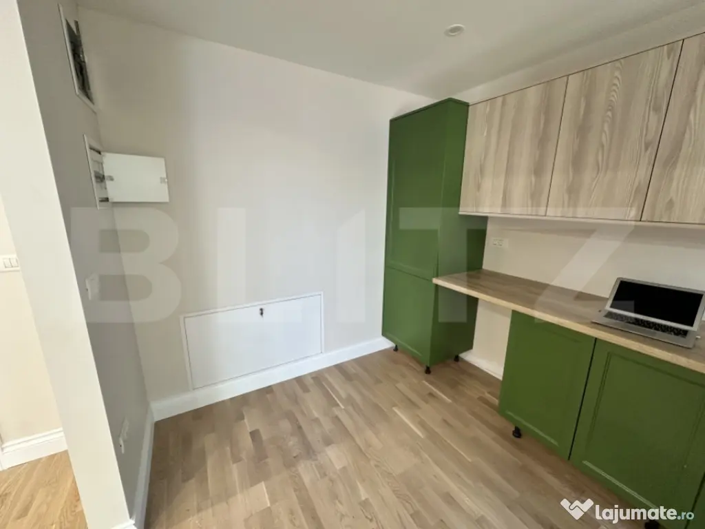 Blitz vă prezintă în exclusivitate un apartament modern cu 2 camere, cu suprafață utilă de 43 mp, situat la Parterul Ansamblului , în compartimentare semidecomandată, într-un ansamblu rezidențial nou care oferă facilități premium precum lift, locuri de parcare și o cafenea la parterul clădirii. Apartamentul este complet mobilat și utilat cu tehnologie de ultimă generație, beneficiind de un sistem audio încorporat în tavan în fiecare încăpere, precum și de un sistem de încălzire și ventilare ultra-eficient realizat prin ventiloconvectoare conectate la o pompă de căldură modernă. Accesul în locuință este unul smart, putând fi realizat prin amprentă, cod, cartelă sau cheie.
