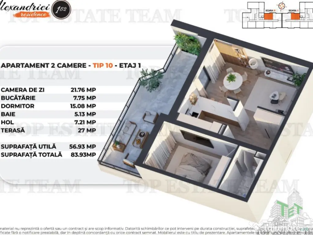 Cel mai important constructor din Ardeal este prezent cu primul proiect in Bucuresti Apartament cu 2 Camere la standard de confort si performanta ridicate pe Soseaua Alexandriei, Bucuresti, intr-un proiect in constructie sustinut de un dezvoltator cu peste 25 de ani de experienta si rezultate remarcabile. Fiecare locuinta din acest proiect este gandita cu grija atat pentru spatiul interior, cat si pentru mediul inconjurator, astfel incat cei care aleg achizitionarea unui apartament sa se simta cu adevarat acasa. Apartamentul are o suprafata utila de 56.93, suprafata totala de 83.93 mp si este compartimentat dupa cum urmeaza: Camera de zi: 21.76 mp Bucatarie: 7.75 mp Dormitor: 15.08 mp Hol: 7.21 mp Baie: 5.13 mp Terasa: 27 mp Detalii tehnice: Centrala imobil: Centrale montate in cascada, Viessman, Buderus sau Ariston. Structura rezistenta: Beton armat, planseu tip dala. Fundatie: Radier general. Pereti exteriori: Zidarie din beton celular autoclavizat, 30 cm. Pereti intre apartamente: Zidarie din beton celular autoclavizat, 25 cm. Pereti interiori: Zidarie din beton celular autoclavizat, 12,5 cm. Icirc;naltime utila nivel: 2,75 m. Fatade: Termosistem polistiren 10 cm cu tencuiala decorativa. Terasa: Hidroizolatie membrana PVC (Sika), termoizolatie vata minerala 20 cm. Instalatii electrice: Cupru. Tablouri electrice apartamente: Eaton. Finisaje interioare: Usa acces apartament: Metalica, Blindo 2, Pinum, cu toc metalic, structura din otel zincat, balamale reglabile si izolatie din vata minerala; inchidere in 3 puncte, culoare gri transversal. Usi interioare: Model Revers, structura perimetrala din lemn, panouri MDF laminat, culoare alba. Parchet: SPC, 6 mm, compatibil cu incalzire in pardoseala, Clasa 34, producator PINUM. Faianta baie: Placi ceramice 30x60 cm, model Living Beige, Ecogres. Gresie baie/bucatarie/balcoane: Ecogres, Pietre di Sardegna, Casalgrande Padana, Basaltina. Pardoseli spatii comune: Aceiasi producatori ca pentru gresie. Robinetarie: Hertz. Sanitare: Vas WC, lavoar, cada si dus Ideal Standard. Ferestre si usi balcon: PVC Salamander GreenEvolution 76 MD, 6 camere. Climatizare: Multisplit Gree. Icirc;ncalzire: Pardoseala, Uponor sau Rehau. Prize si intrerupatoare: Legrand sau Gewiss. Confort: 1 Tip imobil: Bloc de apartamente Număr Băi: 1
