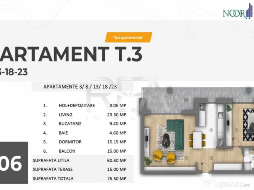 REA Imobiliare Apartament cu 2 camere, decomadat, etaj 2/6, rezidential Noor Unirii. Suprafata totala de 75,50 mp din care suprafata utila de 60,50 mp, suprafata balcon 15 mp.Sistem incalzire -> centrala imobil. Configuratie: sufragerie, dormitor, bucatarie, baie, balcon. Loc de parcare separat la subsol 25k Euro + TVA. Transpor in comun -> 3 min pana la statiile STB si 8 min pana la statia de metrou Piata Unirii. Pentru detalii si vizionari va rugam sa ne contactati specificand codul de identificare P9861. Id intern: P9904 Confort: 1 Tip imobil: Bloc de apartamente Număr Băi: 1