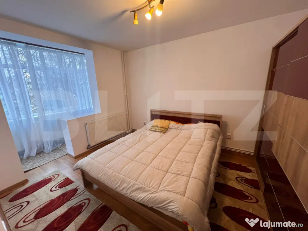 Locuința se închiriază complet mobilată și utilată, fiind pregătită pentru mutare imediată. Bucătăria este dotată cu aragaz, cuptor și frigider. Livingul este amenajat cu canapea și mobilier specific pentru relaxare, iar dormitorul dispune de pat matrimonial și dulap. Baia este complet utilată.