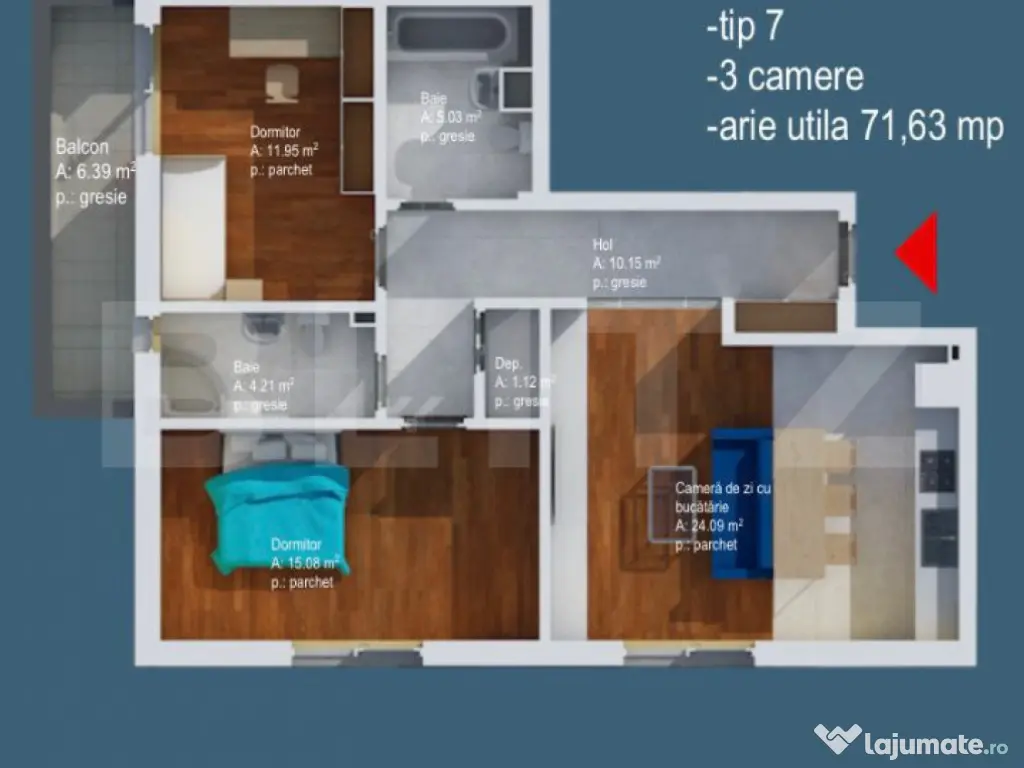 Apartament 3 Camere | 72 mp | 2 Băi | Balcon | Sud-Vest | B
