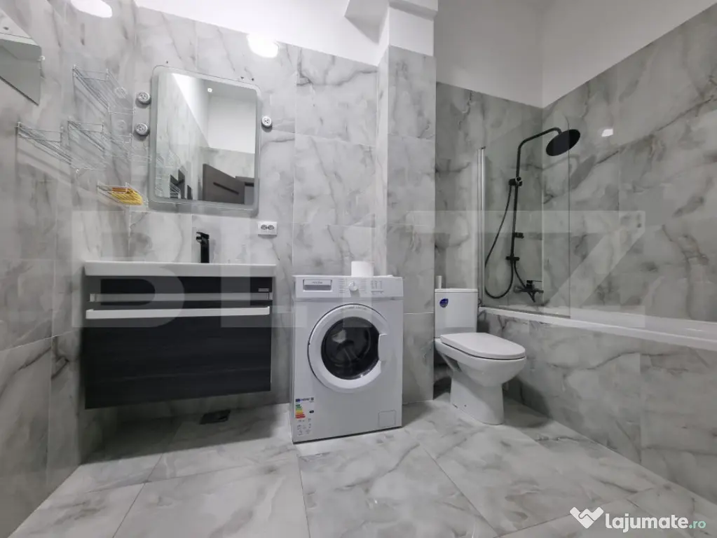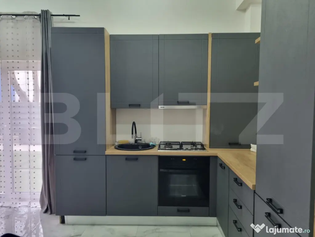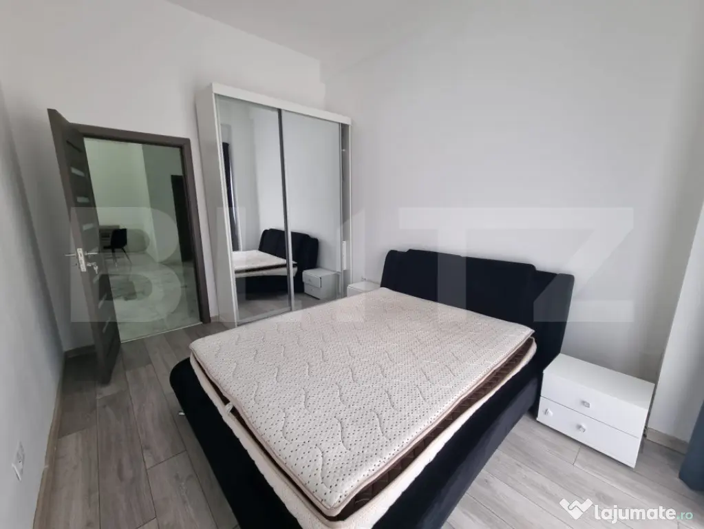 Apartamentul are o compartimentare moderna, fiind compus din living cu bucatarie open space, 2 dormitoare si baie. Blocul a fost finalizat in 2023, retras de la strada principala. Apartamentul se preda mobilat si utilat. Dispune de centrala termica proprie, incalzire in pardoseala, geamuri termopan cu trei sticle si usa metalica la intrare.