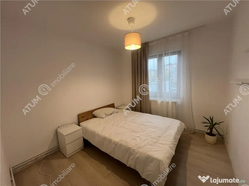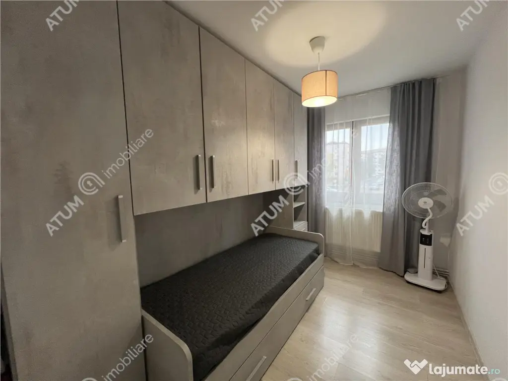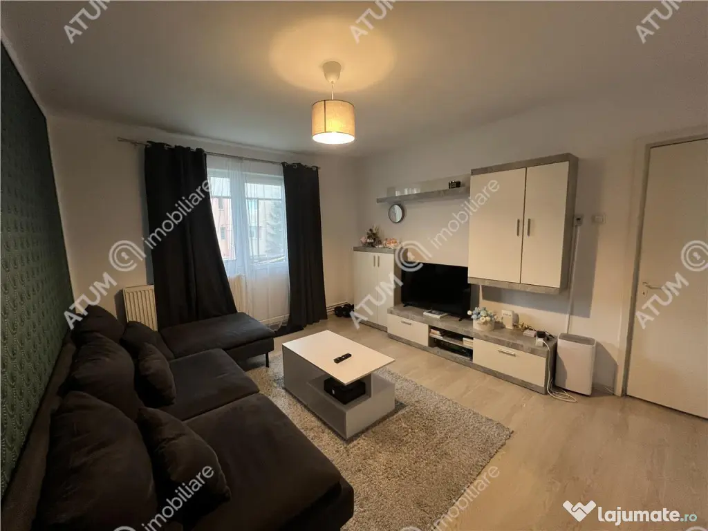 Apartament de 3 camere cu balcon si pivnita uscata de 10 mp de vanzare in Sibiu, zona Mihai Viteazul, orientat SUD-EST, situat la etajul intermediar 1 al unui imobil cu 5 niveluri si doar 4 apartamente pe palier. Locuinta in suprafata de 56 mp utili este compusa dintr-un living generos, 2 dormitoare, baie amenajata cu cabina si rigola, bucatarie separata cu loc special amenajat de luat masa si hol de acces unde se afla cuierul cu pantofar. Separat de suprafata utila a apartamentului acesta beneficiaza si de un balcon de 2,50 mp inchis in care se face accesul din camera de zi. Parcarea se realizeaza pe locuri de parcare amenajate atat in fata imobilului cat si imprejurul acestuia, intreaga zona fiind recent reamenajata permite parcarea tuturor locatarilor. Apartamentu se preda cu dotari si finisaje precum: centrala proprie de apartament si calorifere din otel termostatate, usa metalica de acces, usi de lemn la interior, ferestre de termopan cu tamplarie PVC, gresie, parchet laminat, faianta, interfon, preteti zugraviti in vopsea lavabila alba. Locuita se preda complet mobilata si utila cu mobilier de bucatarie cu multiple spatii de depozitare si electrocasnice, mobilier de living diverse spatii de depozitare, dormitorul secundar amenajat cu pat care se poate extinde pentru 2 persoane si baia amenajata. Valoarea de vanzare este de 114,900 euro negociabil, acesta poate fi achizitionat si prin accesarea unui credit bancar. ID intern: 3460. Confort: 2 sporit Tip imobil: Bloc de apartamente Număr Băi: 1