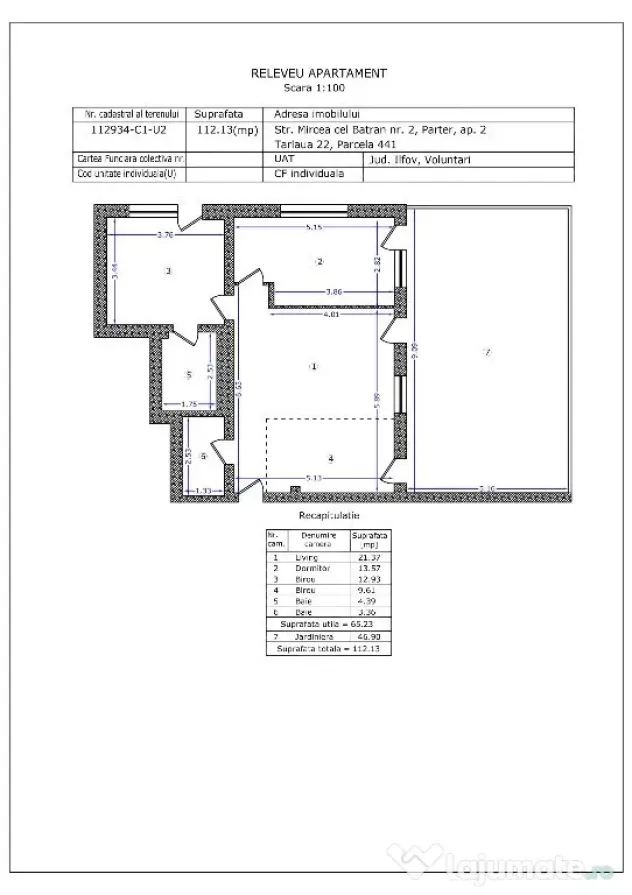 Proprietatea este amplasată la parter și beneficiază de o compartimentare eficientă, ideală pentru o familie sau pentru investiție. Suprafața utilă interioară este de 65.23 mp, la care se adaugă o terasă generoasă cu grădină proprie de 46.90 mp, rezultând o suprafață totală de 112.13 mp.