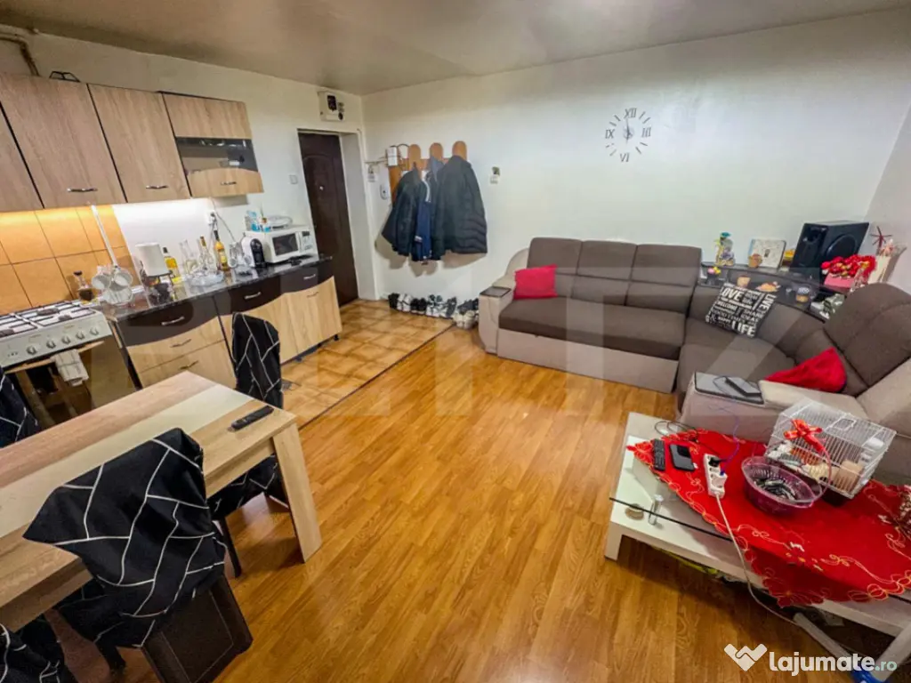 Proprietatea se vinde complet mobilată și utilată, așa cum se vede în fotografii. Este un apartament renovat acum 2 ani, cu geamuri mixte lemn + termopan, menținând un confort termic excelent. Dispune de centrală proprie, ceea ce îl face foarte călduros și economic, cu costuri mici la întreținere.