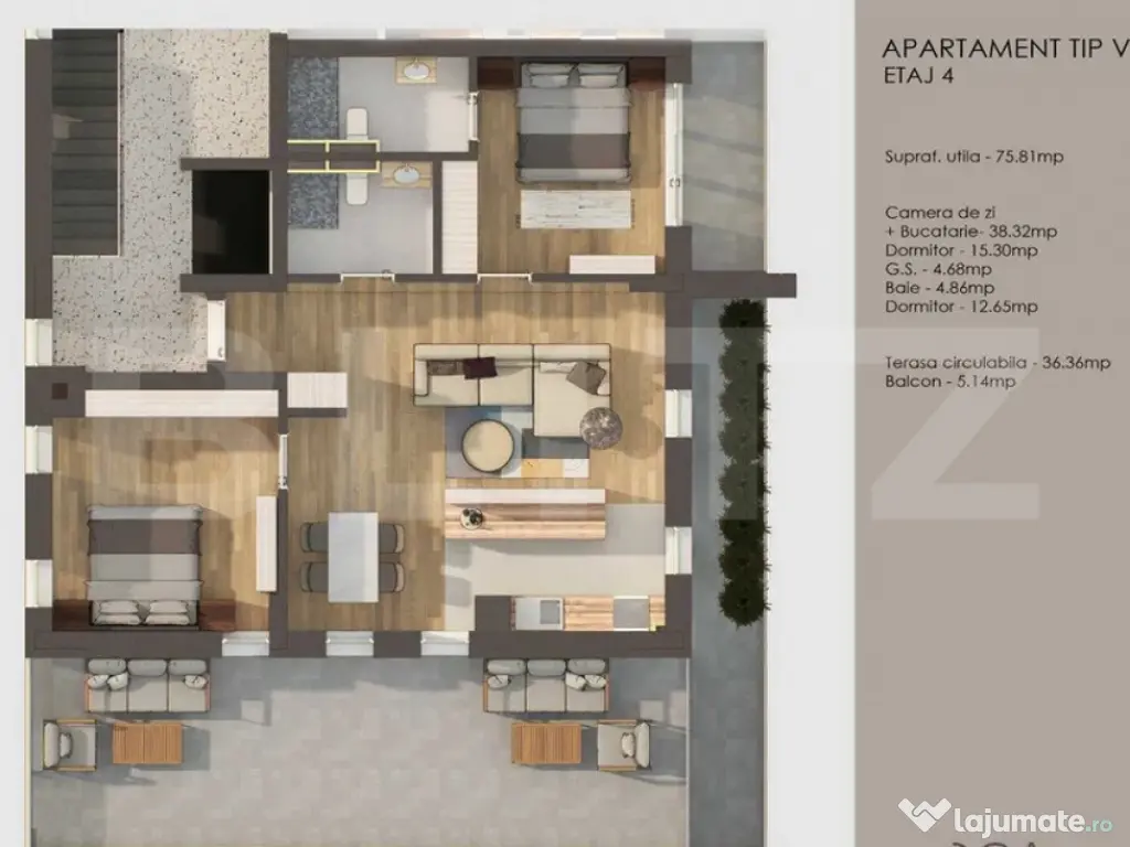 BLITZ propune spre vânzare un apartament deosebit cu 3 camere, situat la etajul 4 (tip 1), într-un bloc nou, modern, din zona premium Tractorul – cea mai atractivă zonă rezidențială din Brașov. Acest apartament impresionează prin terasa generoasă de 37 mp, ideală pentru relaxare, grătar, amenajare tip lounge sau chiar un mic colț verde. La acestea se adaugă și un balcon de 5,14 mp, care completează armonios spațiul exterior. Interiorul are o suprafață utilă de 76 mp, compartimentată eficient pentru confort și funcționalitate, cu încălzire în pardoseală, finisaje premium și luminozitate naturală excelentă. ???? Detalii cheie: Suprafață utilă: 76 mp Terasă: 37 mp Balcon: 5,14 mp Etaj: 4 (tip 1) Camere: 3 Băi: 2 Încălzire în pardoseală Compartimentare: living cu bucătărie open-space, 2 dormitoare, 2 băi, balcon și terasă spațioasă Posibilitate achiziție loc de parcare: 9.000 EUR Această proprietate este ideală pentru cei care își doresc un apartament modern cu spațiu exterior amplu, într-o zonă cu acces rapid la toate facilitățile urbane: mall, parcuri, restaurante, școli și mijloace de transport. ???? Contactează-ne pentru detalii și programarea unei vizionări! Cod ofertă / ID BLITZ: P148087 Id intern: P148087 Confort: 1 Tip imobil: Bloc de apartamente Număr Băi: 2