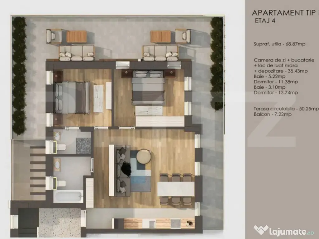 Locuința se remarcă printr-o terasă impresionantă de 50 mp, perfectă pentru momente de relaxare în aer liber, spațiu de socializare, zonă de dining sau chiar o mini grădină urbană. De asemenea, beneficiază și de un balcon 8 mp oferind și mai mult spațiu exterior valoros.