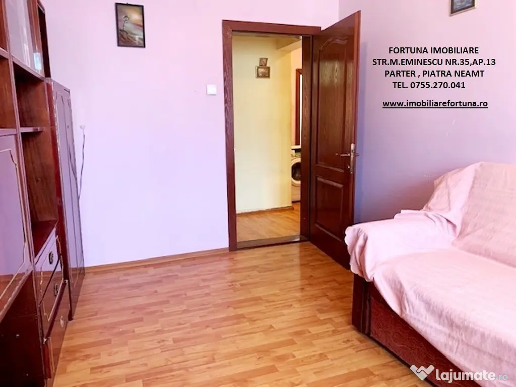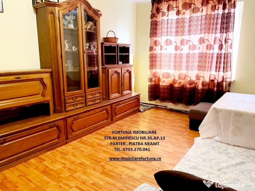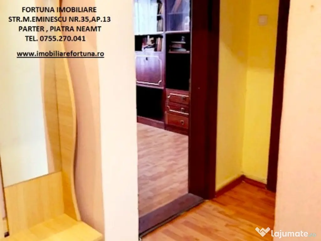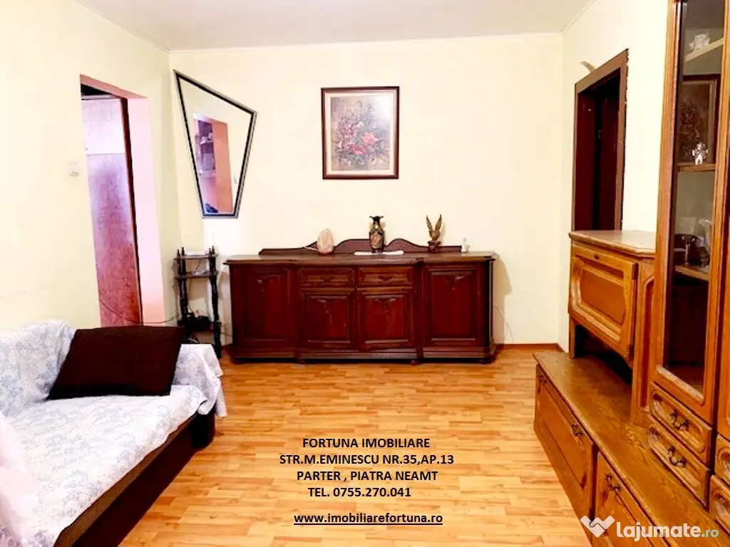 APARTAMENT 3 CAMERE, ZONA LICEUL DE INFORMATICĂ / ORION, 78.000 EURO Dacă vă doriți o investiție sigură și inteligentă pentru viitorul dumneavoastră, FORTUNA IMOBILIARE vă propune acest apartament situat în proximitatea Colegiului Național de Informatică / Orion, într-o zonă liniștită, cu mult spațiu verde, ferită de zgomotul stradal, oferind o ușoară accesibilitate către serviciu, instituții educaționale, medicale, centre comerciale și alte obiective de interes relevante pentru rezidenți/chiriași. Imobilul, este situat la etajul 7 / 10, într-un bloc prevăzut cu lift modernizat. Are orientare cardinală EST - VEST, poziționare pe mijloc și termosistem exterior integral, fiind luminos și călduros. Este prevăzut cu: ușă antiefracție, acces controlat prin interfon, centrală termică, termopane, uși interioare lemn masiv. Are toate instalațiile, sanitară, electrică și termică, schimbate. Are suprafața totală de 73,02 mp, este pe structură semidecomandată, fiind compus din 2 holuri, bucătărie, cameră de zi, baie, 2 dormitoare, debara și 2 balcoane. Beneficiază de un spațiu de depozitare situat pe casa scării. Se vinde mobilat și utilat. Preț 78.000 euro . Pentru o prezentare detaliată a acestei oferte, furnizarea unor informații suplimentare referitoare la situația juridică / identificarea imobilului și programarea unei vizionări, vă invităm la sediul nostru, Fortuna Imobiliare, situat pe str. M. Eminescu, nr. 35, ap. 13, parter, lângă fostul Tribunal, tel. contact 0755.270.041. Your comfort is our priority ! Oferta noastră completă o găsiți aici: https://imobiliarefortuna.ro/ Confort: 2 Tip imobil: Bloc de apartamente
