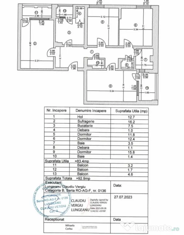 Apartamentul oferă un spațiu ideal pentru o familie, având compartimentare practică și multiple spații de depozitare.