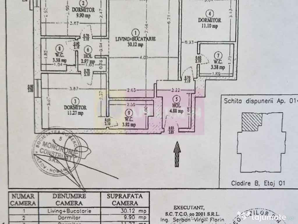 Suprafaţă utilă 91,14 mp, două balcoane (unul închis), două băi, trei dormitoare, living şi bucătărie open space.