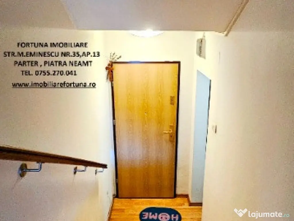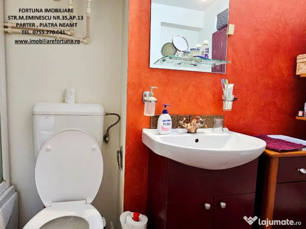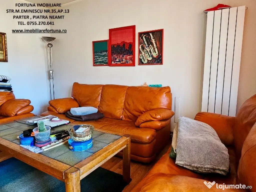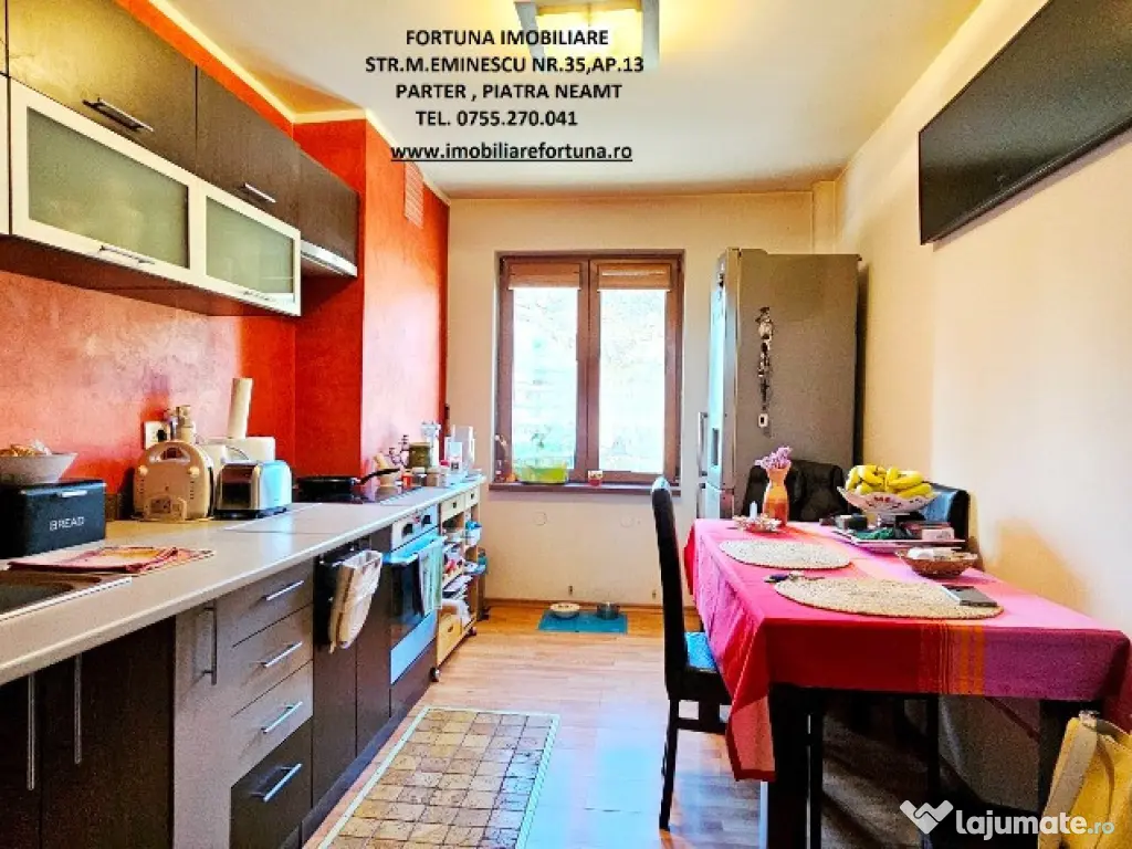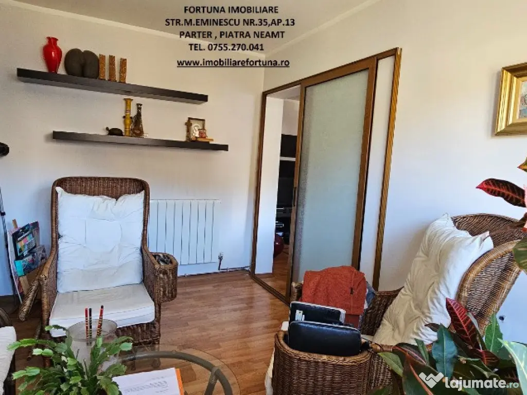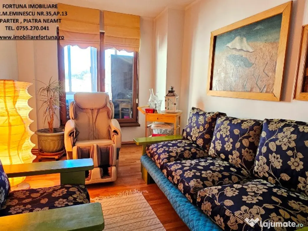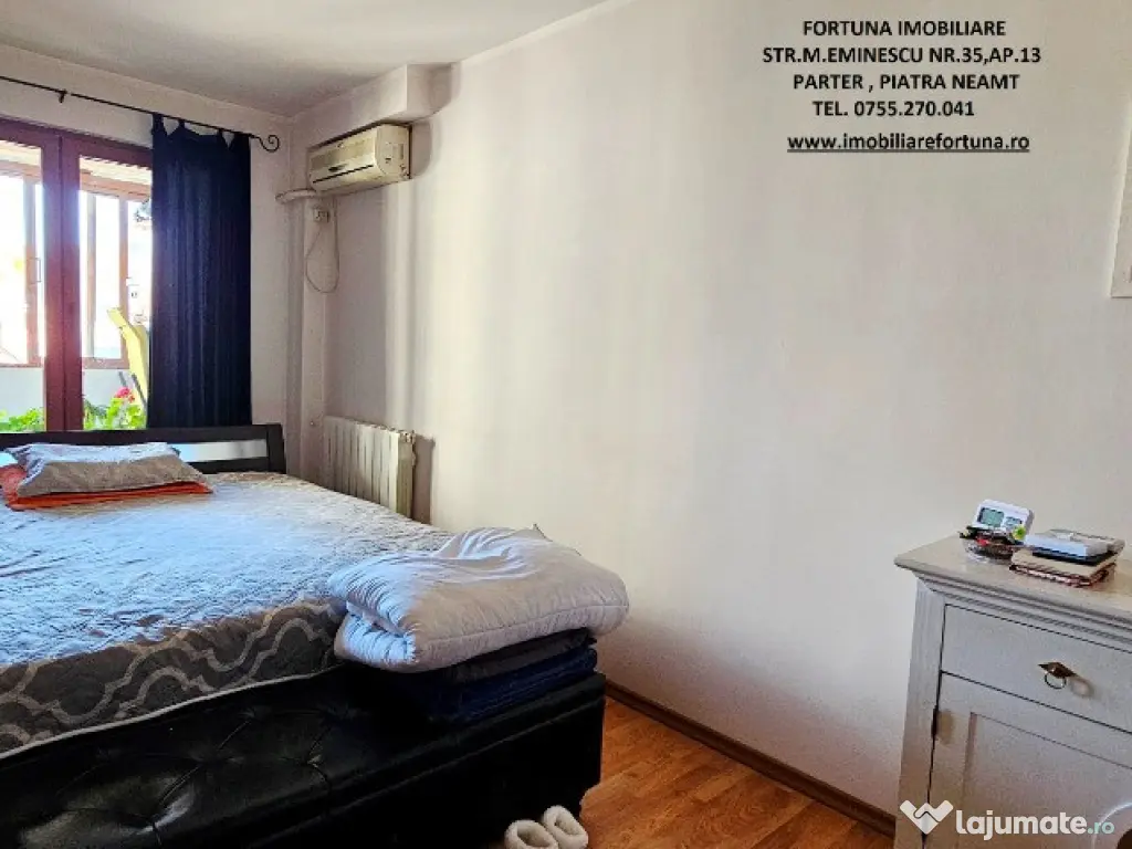 APARTAMENT 5 CAMERE, 2 BĂI, BALCON, BOXĂ, LOC DE PARCARE, SITUAT ÎN ZONĂ CENTRALĂ, 125.000 EURO Dacă vrei să te menții în formă într-o atmosferă selectă și boemă, FORTUNA IMOBILIARE îți propune spre achiziție o superbă proprietate, amplasată în zona centrală a orașului, care se remarcă printr-o configurație unică, cu o compartimentare inteligentă, ce îmbină stilul arhitectural casă-apartament, ideal pentru familii active, ce oferă o serie de avantaje: - îmbină un lifestyle de lux, în concordanță cu ansamblul rezidențial din care face parte; - nu mănânci și nu dormi la același nivel, scara interioară și modul de dispunere al camerelor oferind intimitate membrilor familiei și apropiaților, precum și necesitatea de a face zilnic mișcare; - oferă o priveliște spectaculoasă, încăperi luminoase, puse în valoare de finisajele personalizate pentru fiecare spațiu în parte; - se află la confluența principalelor obiective de interes din Municipiul Piatra Neamț (turistice, comerciale, culturale, educaționale, recreative, medicale etc). Proprietatea cu o suprafață totală de 108,94 mp se desfășoară pe 3 nivele și este compusă din living, 4 dormitoare, 1 bucătărie generoasă, 2 băi, 3 holuri, 2 dressinguri, casa scării și balcon mare tip terasa. Imobilul este prevăzut cu multiple îmbunătățiri : ușă antiefracție, acces controlat prin interfon, termopan, uși interioare din lemn, instalațiile sanitară și electrică schimbate, cea termică pe cupru, gresie, faianță și parchet. Are 2 unități de aer condiționat ( câte una pentru fiecare nivel ), sistem de încălzire alternativ, constând în plasme termice pentru fiecare încăpere, precum și boiler electric la baia principală. Oferă un confort termic performant ( reflectat de facturi reduse ), fiind situat pe mijloc, beneficiind de termosistem exterior integral și orientare cardinală EST – VEST. Deține boxă situată la subsolul blocului și loc de parare. Preț: 125.000 euro Întrucât descrierea acestui ansamblu imobiliar nu poate fi cuprinsă în câteva rânduri, pentru o prezentare detaliată te invit la sediul nostru, Fortuna Imobiliare, str. M. Eminescu, nr. 35, ap. 13, parter, lângă fostul Tribunal, tel. contact 0755.270.041. Dacă vă place ceea ce vei găsi la fața locului, ne vom ocupa ca proprietatea să rămână mobilată, pentru a te bucura de o mutare și o instalare rapidă. Oferta noastră completă o găsiți aici: https://imobiliarefortuna.ro/ Confort: 1 Tip imobil: Bloc de apartamente