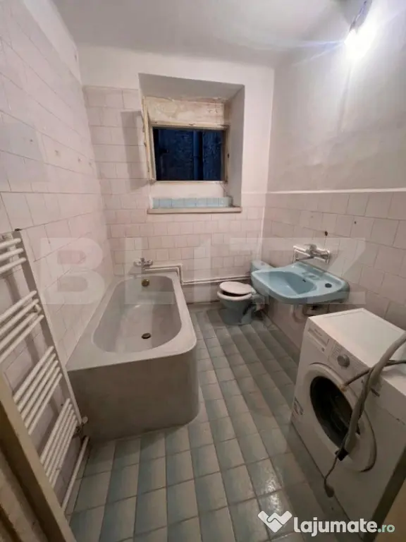 Proprietatea include 2 băi: una principală, dotată cu cadă și mașină de spălat, și o baie de serviciu.