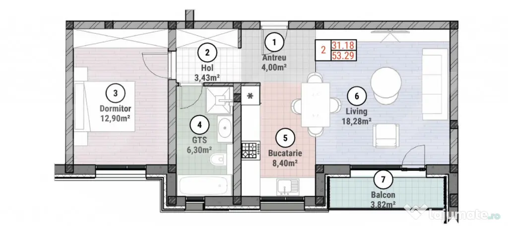 Proprietatea este compusă din : living+ bucătărie , dormitor , baie+ balcon de 4,49 mp. suprafată utilă 57,49 mp.