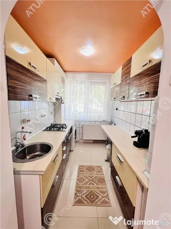 Locuinta se preda complet mobilata si utilata, corpurile de bucatarie realizate pe comanda, electrocasnice precum plita pe gaz si cuptor electric marca Electrolux, hota, frigider, masina de spalat rufe.