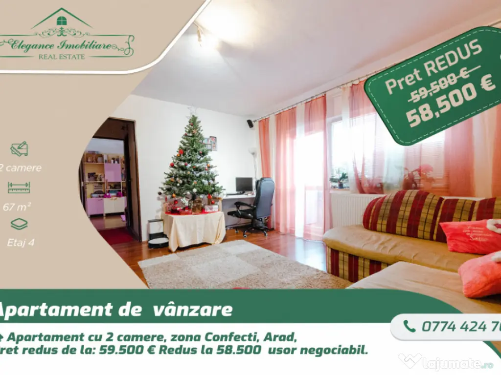 Elegance Imobiliare vă propune spre achiziție un apartament cu 2 camere, situat în zona Confectii din Arad, la etajul 4 al unui imobil cu 4 niveluri. Proprietatea se remarcă printr-o compartimentare echilibrată și un spațiu bine valorificat, fiind potrivită atât pentru locuire personală, cât și pentru investiție. Apartamentul are o suprafață construită de 67 mp, este semidecomandat și se vinde complet mobilat și utilat, oferind posibilitatea mutării imediate. Locuința este compusă din dormitor, living, bucătărie, baie, hol și un balcon închis cu tâmplărie termoizolantă, care adaugă un plus de funcționalitate și confort. Imobilul este racordat la toate utilitățile necesare: apă, canalizare, energie electrică, gaz, cu centrală termică proprie, internet și televiziune prin fibră optică, asigurând un nivel ridicat de siguranță și control eficient al costurilor lunare. Zona Confectii oferă acces rapid către puncte importante de interes urban. În imediata apropiere se regăsesc spații verzi, locuri de joacă pentru copii, grădinițe, școală, magazine, supermarketuri, bănci și mijloace de transport în comun, facilități care contribuie la un stil de viață comod și bine organizat. O proprietate echilibrată, cu dotări complete și poziționare practică, ideală pentru cei care caută un apartament gata de utilizare într-o zonă bine conectată a orașului. Prețul de promovare al acestui imobil este de 59.500 euro, negociabil. Acest imobil poate fi achiziționat și prin programul Noua Casă sau cu Credit Ipotecar. Pentru mai multe detalii și pentru o vizionare personalizată, contactează-ne la numărul de telefon 0774.424.701. Elegance Imobiliare - partenerul tău de încredere în domeniul imobiliar! Id intern: P229420 Confort: 1 Tip imobil: Bloc de apartamente Număr Băi: 1