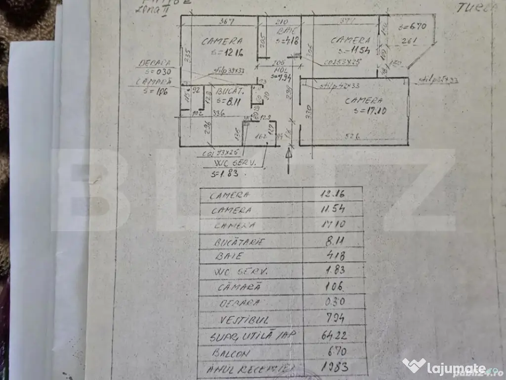 Blitz propune spre vanzare apartament spațios, deocamandat, cu 3 camere in Turda, zona Materna. Acesta este situat la etajul 6 al unui imobil cu 8 nivele. Suprafata este de 71 mp (64,22 apartament si 6,70 balcon) iar compartimentarea se prezinta astfel: 1 hol spatios, 1 bucatarie, 1 living, 2 dormitoare, 2 bai si un balcon de dimensiuni generoase. Imobilul dispune de lift. Confortul termic este asigurat de catre centrala proprie. Imobilul este situat în proximitatea scolii, magazinelor, farmaciilor, parcului, supermarket-urilor si a statiilor de transport in comun. Apartamentul se afla in stare buna si se vinde partial mobilat. Aparatamentul dispune de toate documentele necesare vanzarii iar pretul este negocialbil. Vedere panoramica asupra orasului. Pentru mai multe detalii programeaza o vizionare! Cod ofertă / ID BLITZ: P167065 Id intern: P167065 Confort: 1 Tip imobil: Bloc de apartamente Număr Băi: 2