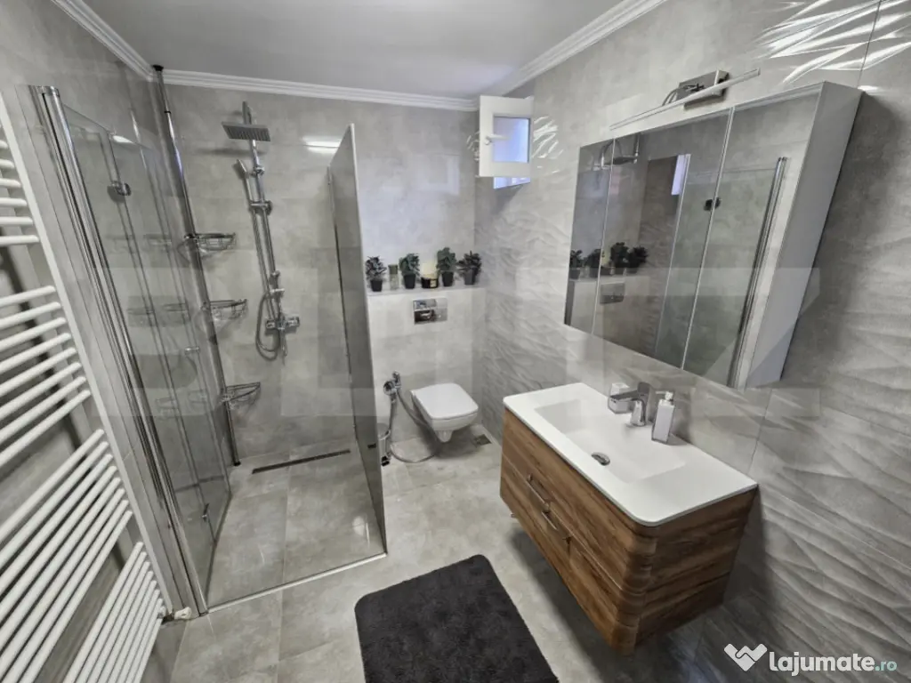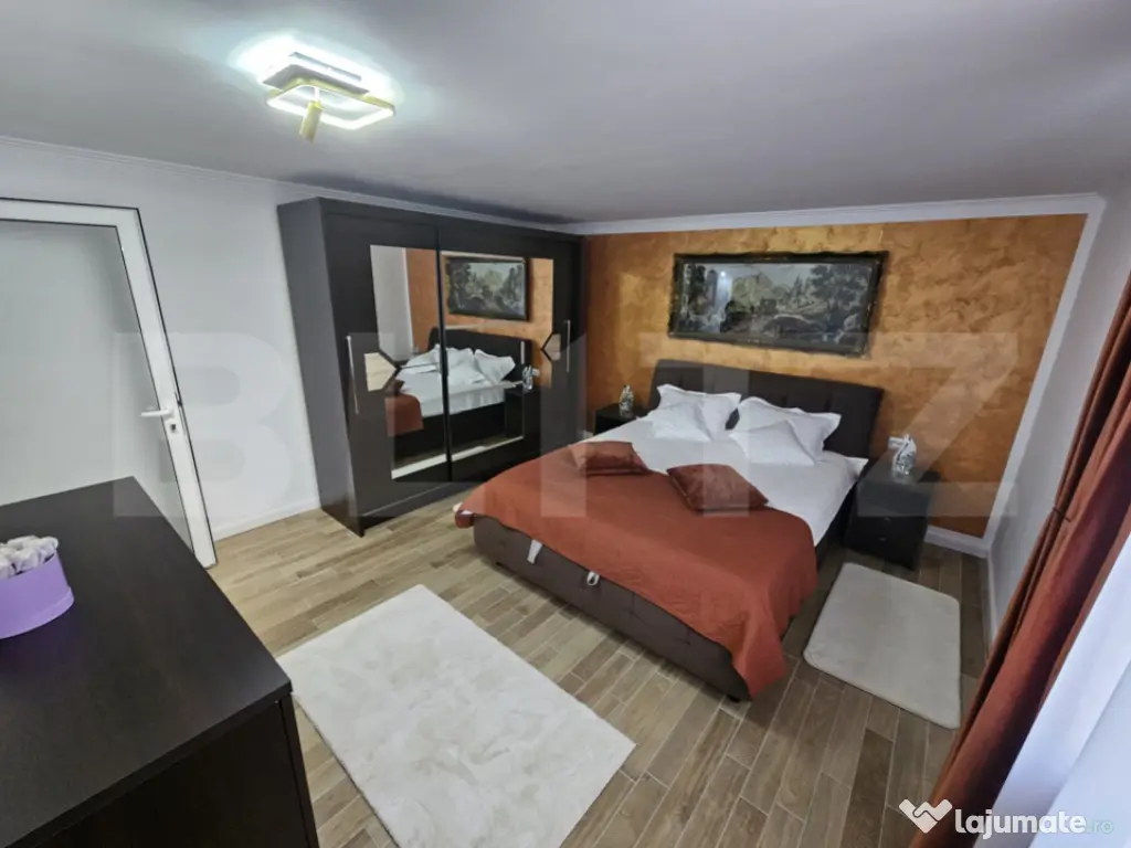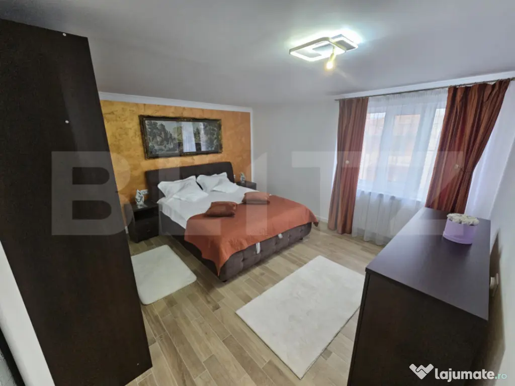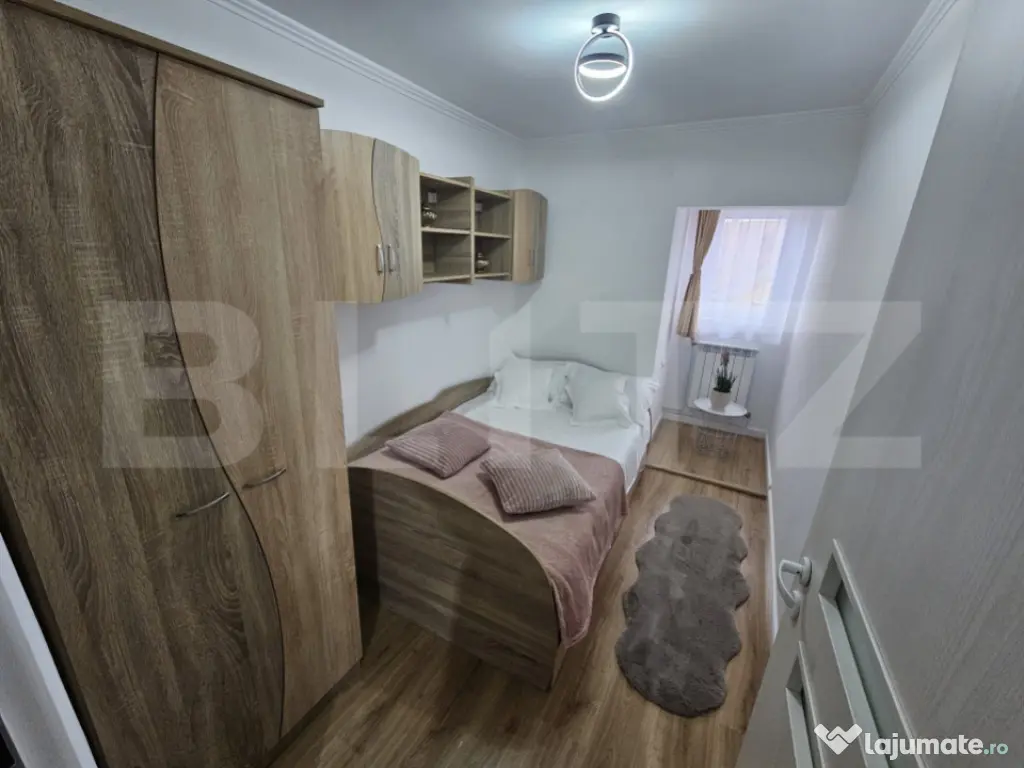 Blitz vă oferă spre închiriere un apartament spațios și luminos, cu 3 camere, situat la etajul 1 al unei case dintr-o zonă liniștită și accesibilă, care poate fi alegerea perfectă pentru tine. Apartamentul este finisat cu materiale de cea mai bună calitate și dispune de tot confortul necesar unui stil de viață modern. Proprietatea dispune de curte privată, ideală pentru relaxare, grătar sau loc de joacă pentru copii. Suprafața utilǎ de aprox. 70 mp, compartimentatǎ într-un living generos cu bucătărie deschisă, 2 dormitoare spațioase, 1 baie modernǎ şi elegantǎ. Complet mobilat și utilat (TV, mașină de spălat, frigider, aragaz, etc.). Încălzire proprie (centrală termică pe gaz). Avantaje ca zonă liniștită, aproape de mijloace de transport, magazine, școli, etc, fără vecini deasupra, acces facil la centru orașului.