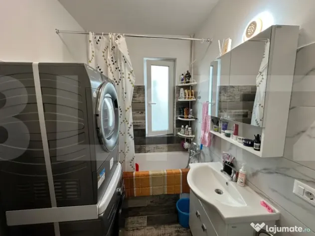 • Baie cu geam și cadă