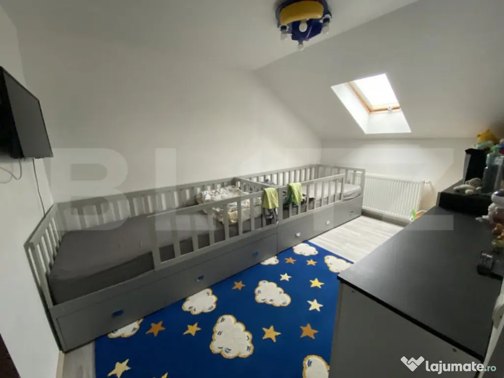BLITZ ofera spre vanzare apartament cu 4 camere in suprafata de 100 mp. Blocul este construit din beton, amplasat pe un teren generos cu spatii verzi. Compartimentare: 3 camere, bucataria deschisa, living, hol si baie, 2 camere fiind amplasate la mansarda impreuna cu un dresing generos. Are acces spre mijloacele de transport fiind foarte facil, farmacii, supermarketuri. Pentru mai multe detalii, contactati-ne cu incredere! Cod ofertă / ID BLITZ: P133553 Id intern: P133553 Confort: 1 Tip imobil: Bloc de apartamente Număr Băi: 1 Nr. locuri parcare: 2