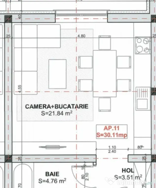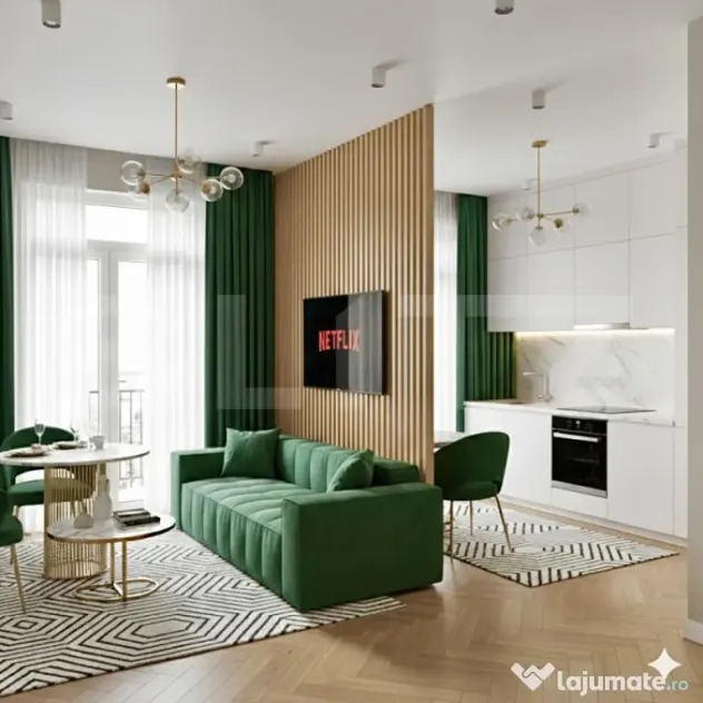 Compartimentarea apartamentului este gandita astfel: un living openspace cu bucatarie, un hol, o baie cu dus. Suprafata utila este 30,11 mp + 6 mp balcon. Detine toate beneficiile unei constructii noi si izolate termic, centrala proprie pe gaz, ferestre tripan, incalzire in pardoseala, obiecte sanitare, baterii, usi interioare,finisaje gresie, parchet, faianta, aparat aer conditionat etc.