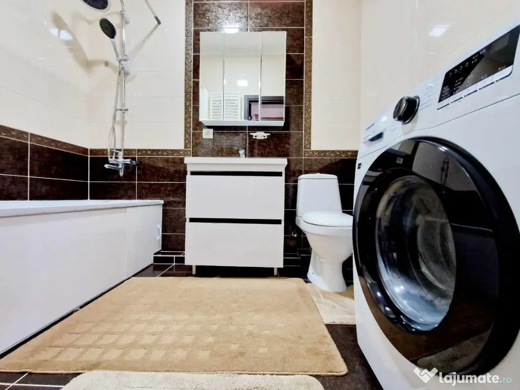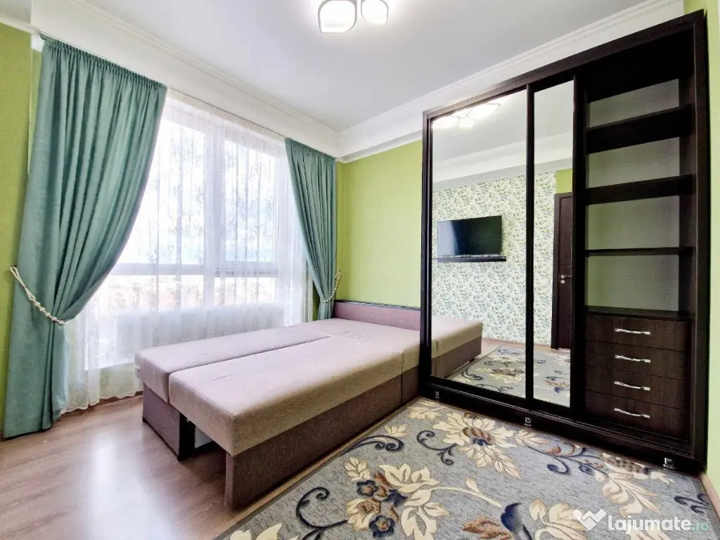 Ofer spre inchiriere apartament cu o camera, TOTUL NOU, avand o suprafata de 43 mp + terasa 10mp. Apartamentul este la etajul 2, cu vedere spre curtea interioara si are urmatoarea compartimentare: bucatarie complet mobilata si utilata, living de tip open space(cu Aer conditionat) , dormitor si baie. Apartamentul nu este pet friendly. Incalzire de la oras. Confort: 1 Tip imobil: Bloc de apartamente