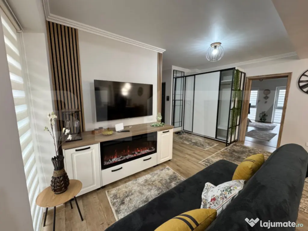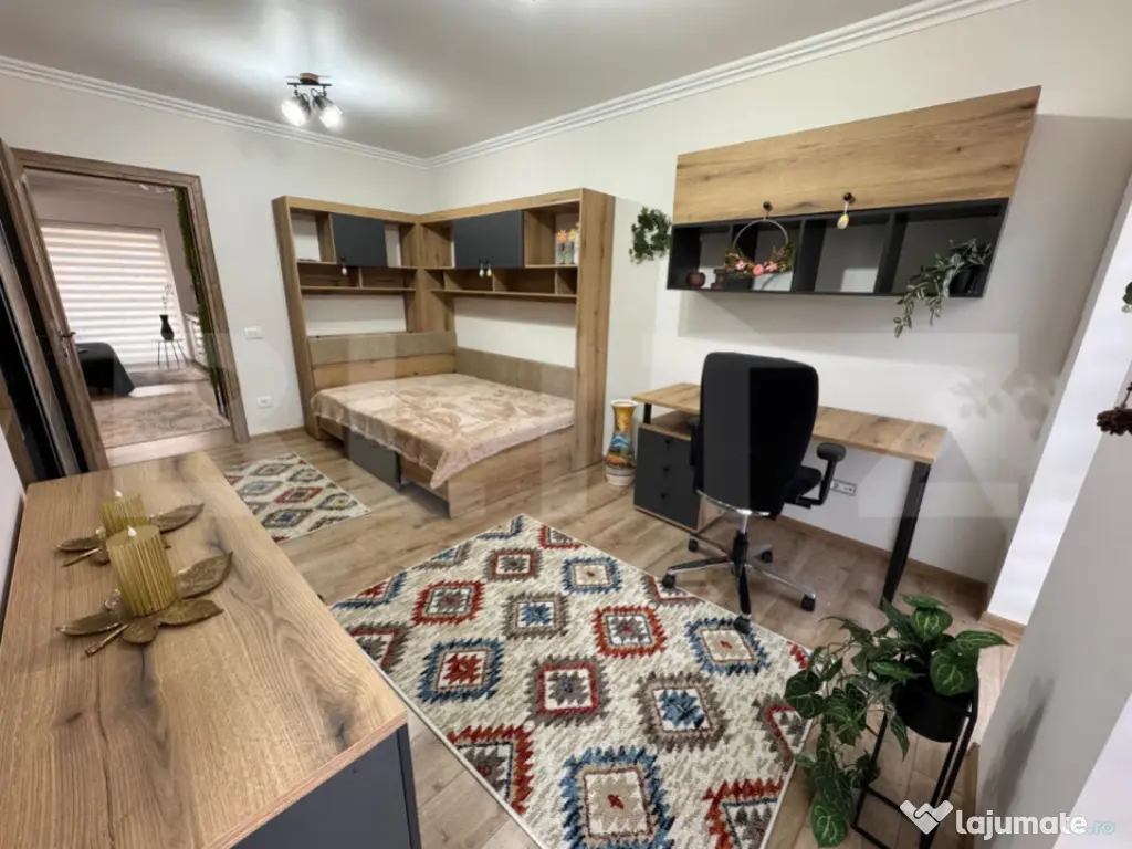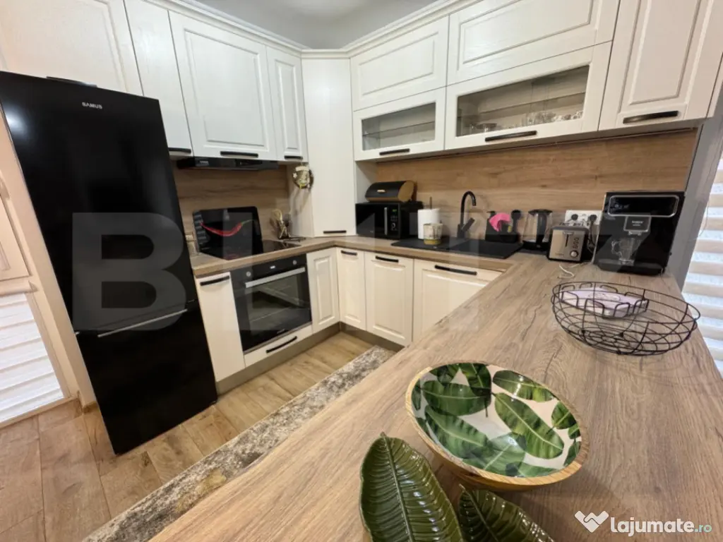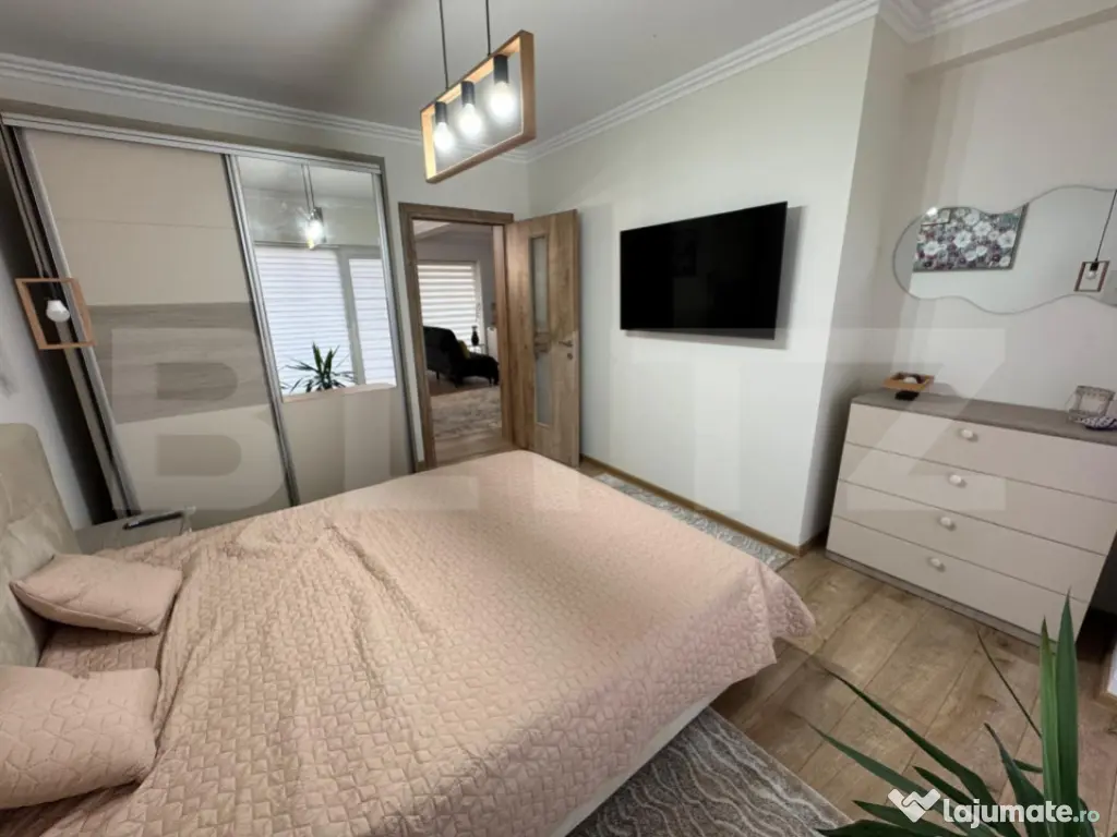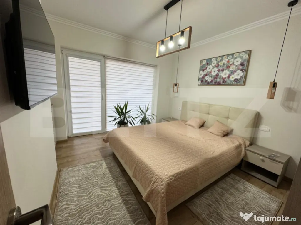 Apartamentul este oferit complet mobilat și utilat cu electrocasnice noi, avand o bucataria “open space” dotata cu: Cuptor incorporat modern, cuptor cu microunde și plita cu inductie; Frigider “no frost” cu congelator; Masina de spalat vase; Hota retractabila; Aparat de cafea (boabe sau macinata); Toaster / Sandwich maker; Toata vesela necesara pentru pregatitul bucatelor sau luarea mesei. Dotari pentru confort: Aer condiționat; Incalzire in pardoseala pe toata suprafața pentru confort termic optim in sezonul rece; Blocul este construit din caramida si izolat termic, ce asigura un consum minim pentru incalzire sau racire; Smart TV cu diagonala mare in living si in dormitorul matrimonial pentru a urmari in confort maxim un serial preferat sau un meci de fotbal; Masa de birou cu priza conectare la internet si TV trase, pentru a asigura viteza maxima de trafic pentru lucru de la domiciliu; Dressinguri incapatoare si comode cu sertare mari in fiecare dormitor si un alt dressing mare in holul apartamentului pentru depozitarea hainelor; Masina de spalat haine cu uscator incorporata in dressingul de pe hol pentru acces si utilizare comoda; Baia este utilata modern: chiuveta cu sertare, oglinda cu iluminare si dezaburire, uscator de prosoape generos, vas WC si dus. Apartamentul este nou, la prima inchiriere.