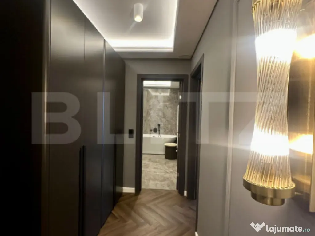 Apartamentul impresionează printr-o zonă de zi amplă, unde livingul, diningul și bucătăria open space se îmbină armonios într-un ambient contemporan, aerisit și perfect funcțional. Finisajele premium, mobilierul realizat la comandă și electrocasnicele de top creează un spațiu sofisticat, pregătit pentru a fi locuit imediat.