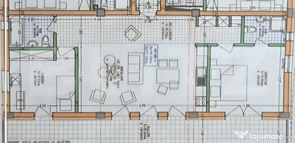 Caracteristici – Living generos cu bucătărie open-space și zonă de luat masa (37,13 mp), 2 dormitoare (14,90 mp și 12,25 mp), 2 băi, balcon spațios (7,40 mp).