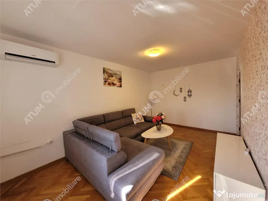 Se ofera spre inchiriere un apartament spatios cu 3 camere, situat la etajul intermediar 5 din 10, intr-un bloc cu lift din zona Vasile Aaron, una dintre cele mai bine cotate zone rezidentiale ale orasului Sibiu. Apartamentul are o suprafata utila de 70 mp, fiind ideal compartimentat decomandat astfel: living luminos, doua dormitoare, bucatarie separata inchisa, baie, debara, doua holuri si un balcon . Compartimentarea este practica, oferind intimitate si confort pentru o familie sau un cuplu. Proprietatatea este dotata cu geamuri cu tamplarie din PVC si sticla termopan, usa de acces metalica, usi interioare din lemn, centrala proprie pe gaz cu incalzire prin calorifere, este montat aparat de aer conditionat in living, podeaua este placata cu parchet si gresie, peretii placati cu faianta dar si tapet pentru o pata de culoare in living. Locuinta este mobilata si utilata complet avand bucataria dotata cu aragaz, frigider, cuptor cu microunde, dispune de masina de spalat, aspirator, cablu TV si internet. Imobilul este bine intretinut, beneficiaza de izolatie termica si are orientare favorabila Sud-Est, ceea ce asigura lumina naturala pe tot parcursul zilei. Blocul este dotat cu lift si are acces usor catre mijloacele de transport in comun, magazine, scoli si alte puncte de interes din zona. Valoarea de inchiriere a apartamentului este de 500 euro o garantie. ID intern 2893 Confort: 1 sporit Tip imobil: Bloc de apartamente Număr Băi: 1
