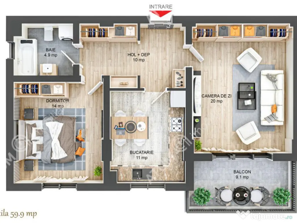 Comision 0 la achizitie ! De vanzare apartament cu 2 camere decomandate si terasa, in suprafata totala de 81 mp, pozitionat la etaj intermediar , localizat in zona Rahovei din Sibiu. Apartamentul face parte dintr-un complex rezidential alcatuit din Subsol Parter 4 Etaje Etaj Retras, edificat pe structura de cadre si grinzi din beton armat, zidarie din caramida de 30 cm care este placata cu izolatie termica exterioara de 10 cm cu densitatea EPS 80 peste care este aplicata vopseaua decorativa siliconata. Printre dotarile imobilului amintim si liftul silentios de ultima generatie, usa de acces in imobil din PVC cu inchidere electromagnetica si acoperisul terasat. Locuinta are 60 mp utili si este compusa din camera de zi 20.00 mp, dormitor generos de 14.00 mp, bucatarie spatioasa de 11.00 mp, baia de 4.90 mp prevazuta cu cada si geam pentru aerisire si holul de 10 mp unde se afla spatii destinate cuierului cu pantofar si chiar a unui dressing. Pe langa suprafata utila de 60 mp a apartamentului mentionam si balconul tip terasa de 9.10 mp in care se poate intra din camera de zi. Imobilul dispune de locuri proprii de parcare supraterane si subterane. Locuinta se preda la stadiul de cheie, iar amenajarile interioare pot fi alese de dumneavoastra in limita unui buget: Apartamentul se va preda la stadiul de alb cu finisaje standard precum: - Usa metalica antiefractie de acces placata cu panou MDF marca Porta-Doors; - Tamplarie PVC 7 camere cu geam termopan LOW-E trei foi de sticla, glafuri interioare si exterioare; - Instalatie termica cu centrala termica, calorifere de otel montate pe pozitie, repartitor/distribuitori si tevi multristrat PEX-AL-PE de la distribuitor la calorifere; - Pereti interiori tencuiti ( tencuiala pe baza de var-ciment ), gletuiti si zugraviti in lavabila alba; - Sape de egalizare elicopterizate; - Interfon functional; - Instalatii electrice cu tablou general individual si sigurante pentru consumatorii de putere, doze, dulii, prize si intrerupatoare montate marca Schneider Sedna, instalatii pentru curenti slabi ( TV, Telefon, Internet ); - Racorduri apa-canal in baie si bucatarie; - Racord gaz metan in bucatarie; - Contorizari individuale si contoare montate pentru Gaz, Curent si Apa; - Balcon inchis cu parapet din teava rectangulara si placat cu gresie antiderapanta de exterior; Optional apartamentul se poate preda la stadiul de cheie cu gresie si faianta icirc;n bucatarie, gresie si faianta icirc;n bai, obiecte sanitare ( cabina de dus/cada, lavoar, vas wc, baterii cada/lavoar ), parchet laminat, usi de interior marca Porta Doors, corpuri de iluminat intr-un buget prestabilit. Spatiile comune interioare sunt complet finisate, casa scarii este generoasa, dispune de trei ascensoare electrice de ultima generatie cu functionare silentioasa, acces securizat, scarii placate cu granit, mana curenta din teava rectangulara, plafoniere cu senzori de miscare si zugraveli in lavabila alba. Spatiile comune exterioare si interioare vor fi iluminate cu stalpi de iluminat si corpuri de iluminat cu senzori de miscare, iar in curtea interioara va fi amenajat un loc privat de joaca pentru copii, amenajat cu nisip, topogan, leagane si banci. Valoarea de achizitionare a apartamentului in urma unui avans de 15% este de 124.000, se poate achizitiona si prin credit ipotecar.ID intern: 1841. Confort: 1 Tip imobil: Bloc de apartamente Număr Băi: 1